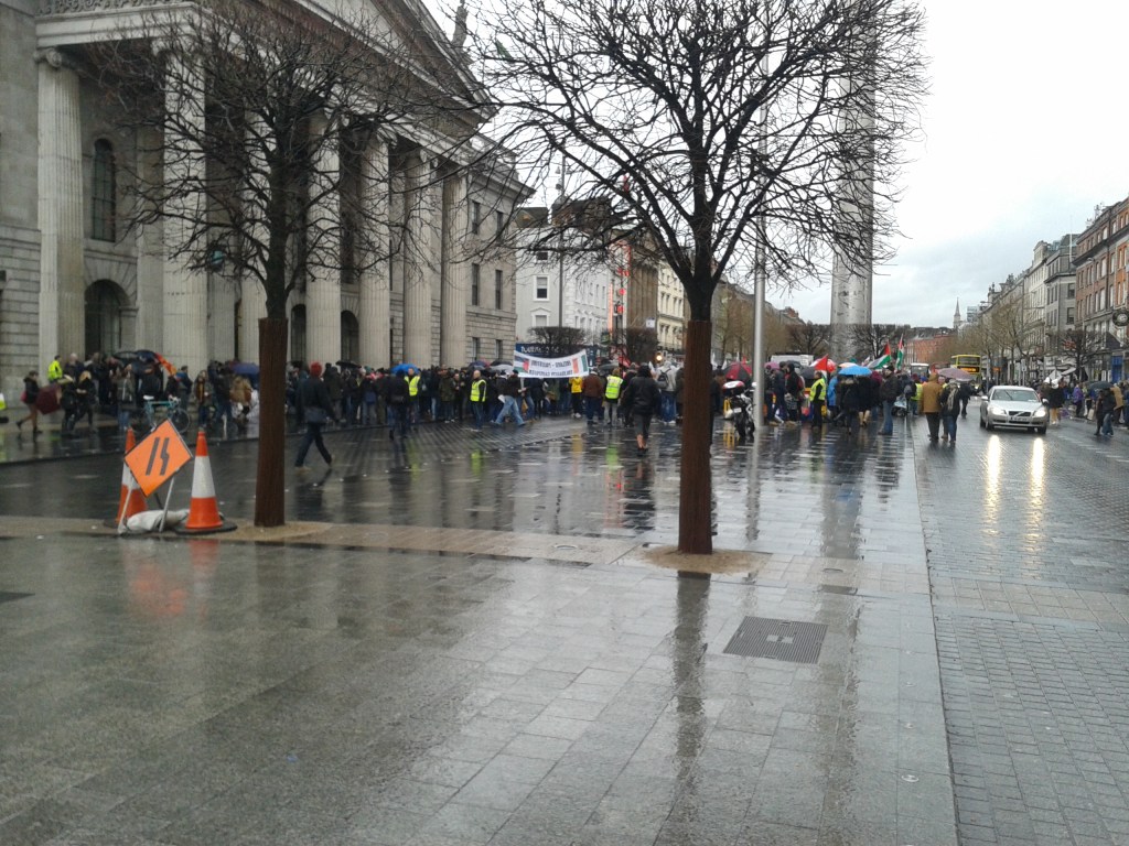 10 He does in fact but you’d need x-ray vision to see it through a scarf! There had been a mass campaign against the proposed additional water charges and the belief that the public water supply system in the Irish state was about to be privatised. Protesting in the context that water charges were already being paid through two different public taxes, hundreds of thousands marched and smaller groups mobilised to disrupt the installation of water meters outside people’s houses (the locations of those unused meters may still be seen around Dublin city in particular). Most arrests took place in this latter part of the struggle, though a number of defendants fought a successful battle to prevent the State convicting them of “kidnapping” a Government Minister while protesting against her ministerial visit to a school in Jobstown. The additional taxation and privatisation plan was abandoned in 2015 – at least for the moment.
