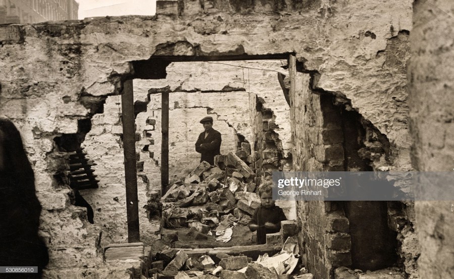 In the summer of 1922, police and soldiers carrying out raids in the Grove Street area (off North Queen) reported that “…the search revealed that the yards on the Grove Street side were tunnelled the whole length of the street, and access to Grove Street could be made from Vere Street through another tunnel.” (Belfast Newsletter, 21/8/1922). The photograph above and below shows some of those yard walls in Grove Street and Vere Street (the next street over – note the same man in the cap in both photos), and appeared in the contemporary press coverage. In each case the brickwork was removed from the walls that separated the back yards of houses from each other. By doing so, people could move from back yard to back yard while hidden from view by the exterior walls.