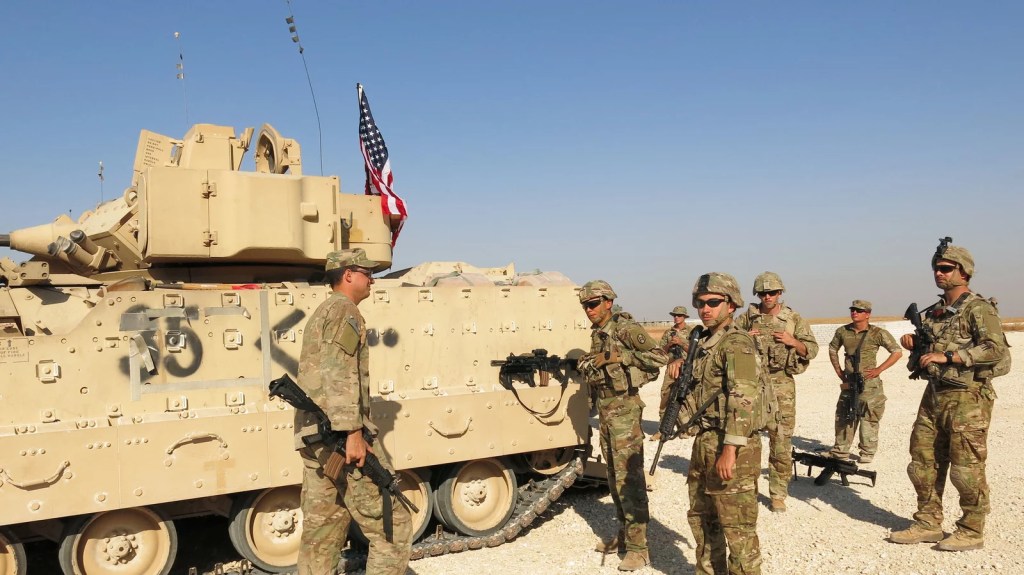 A new U.S. brigade combat team arrives in front of a Bradley Fighting Vehicle at a base in Syria’s Hasakah province in 2019. (Photo cred: Jane Arraf/NPR)