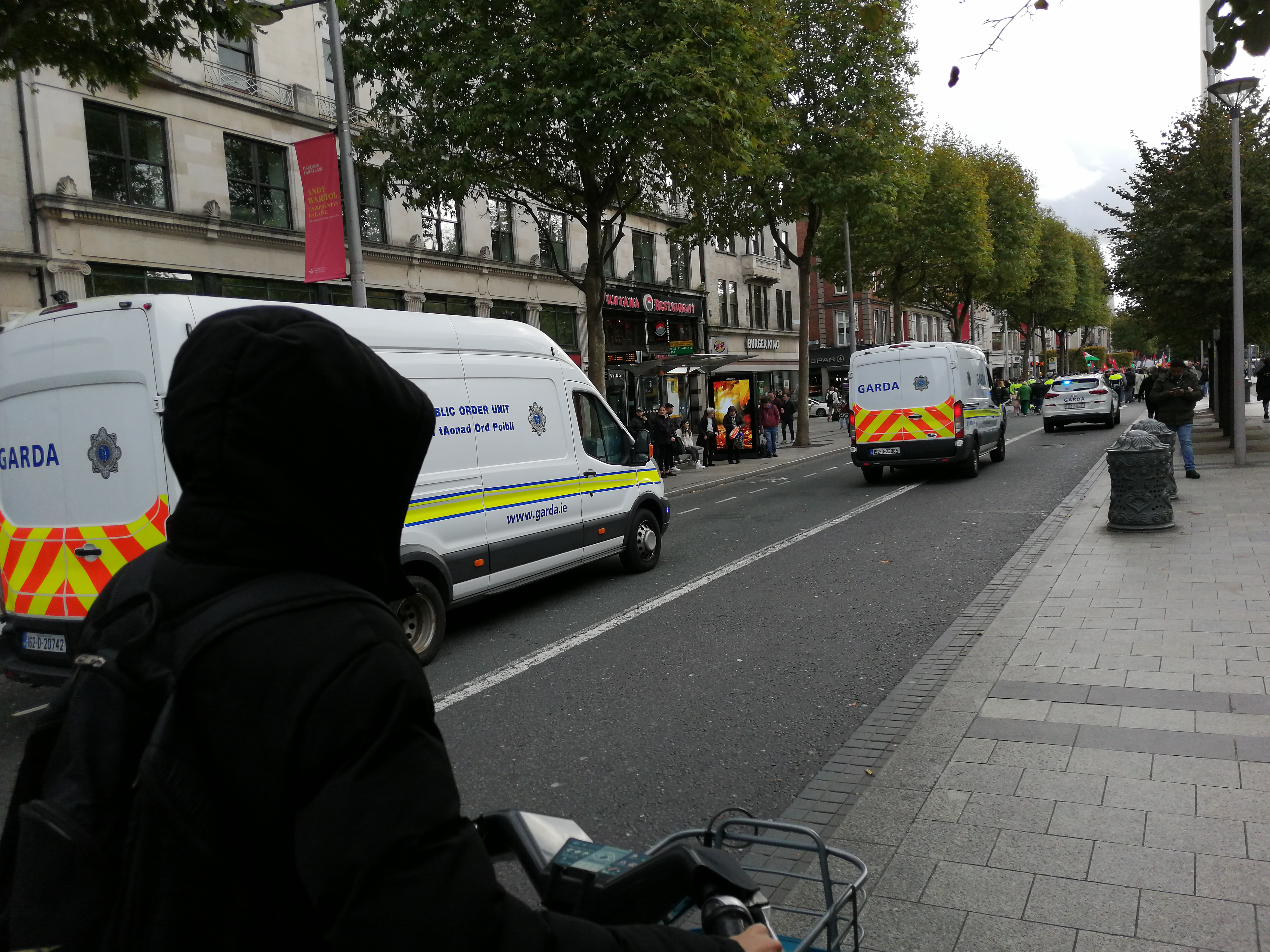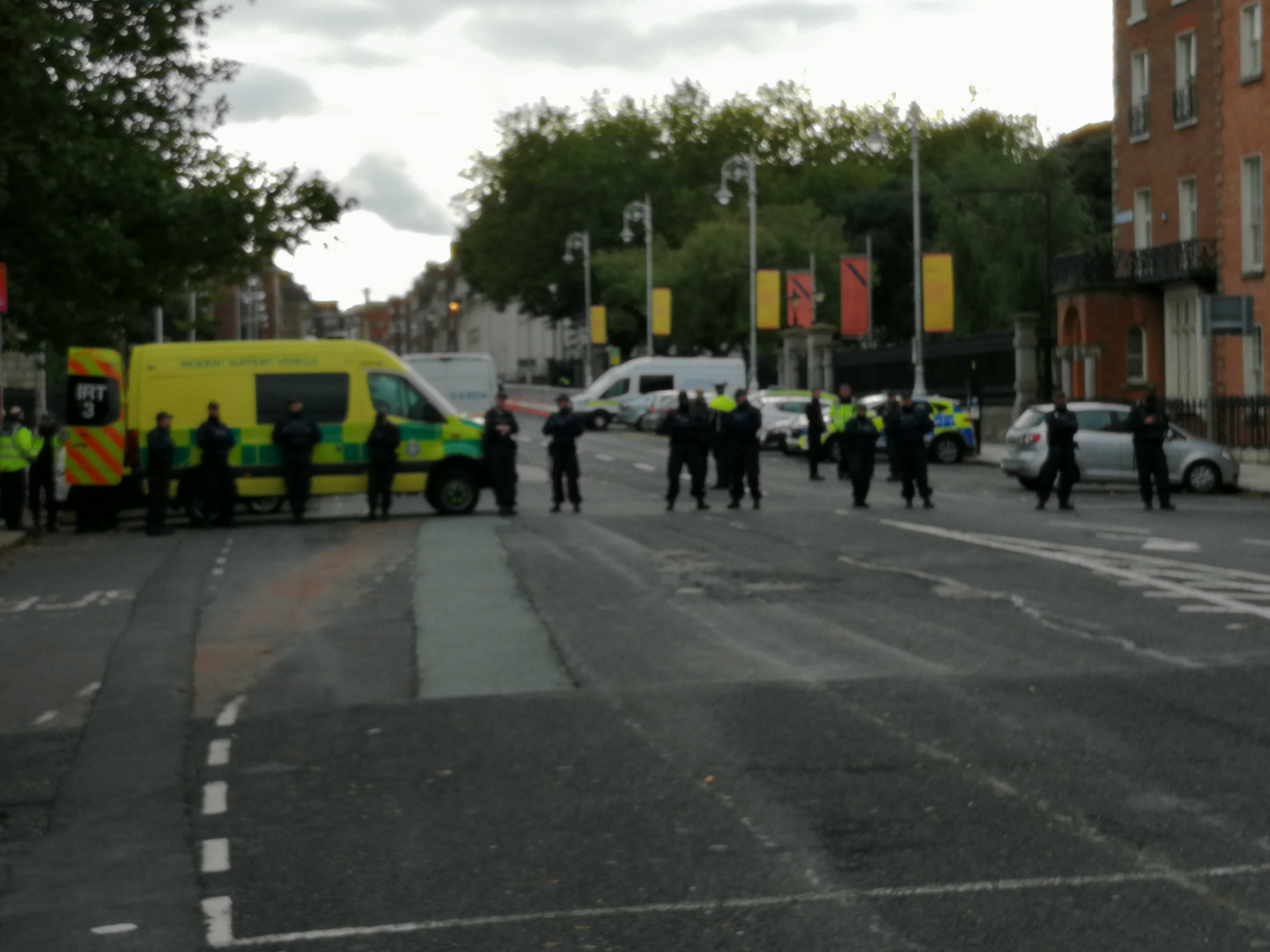 The Gardaí must have feared trouble as an unusual number of vans and patrol cars followed the march; a Public Order Unit had the entire Merrion Square North street cordoned off and the whole front of Leinster House blocked by interlocking mesh aluminium panels with a step behind each.