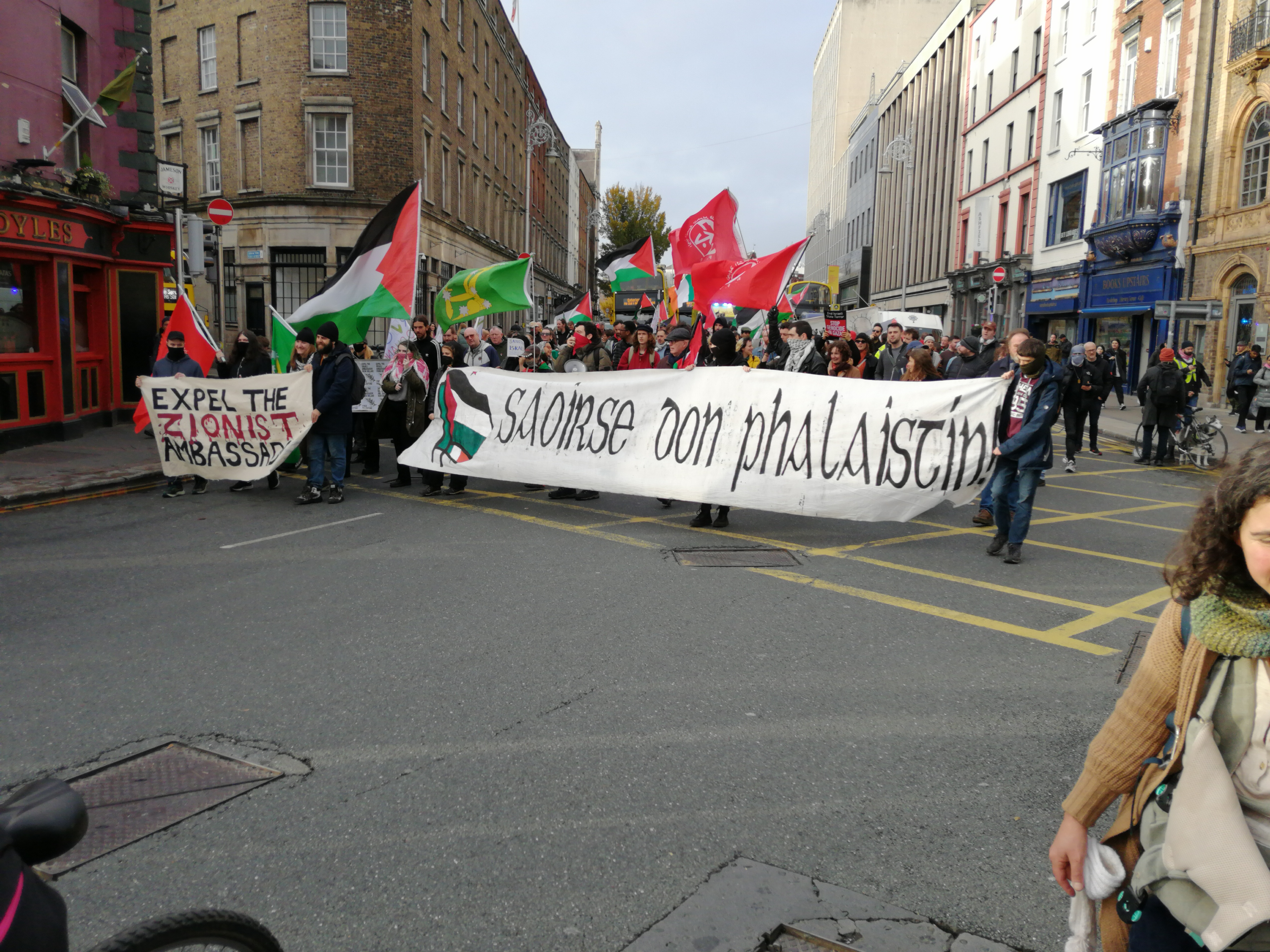 Despite the necessary problems caused to vehicular traffic, a horn blowing from a passing car or van called out often in solidarity to a cheer from the marchers in reply. In contrast to the early decades of the Irish state, the population has become overwhelmingly pro-Palestinian.