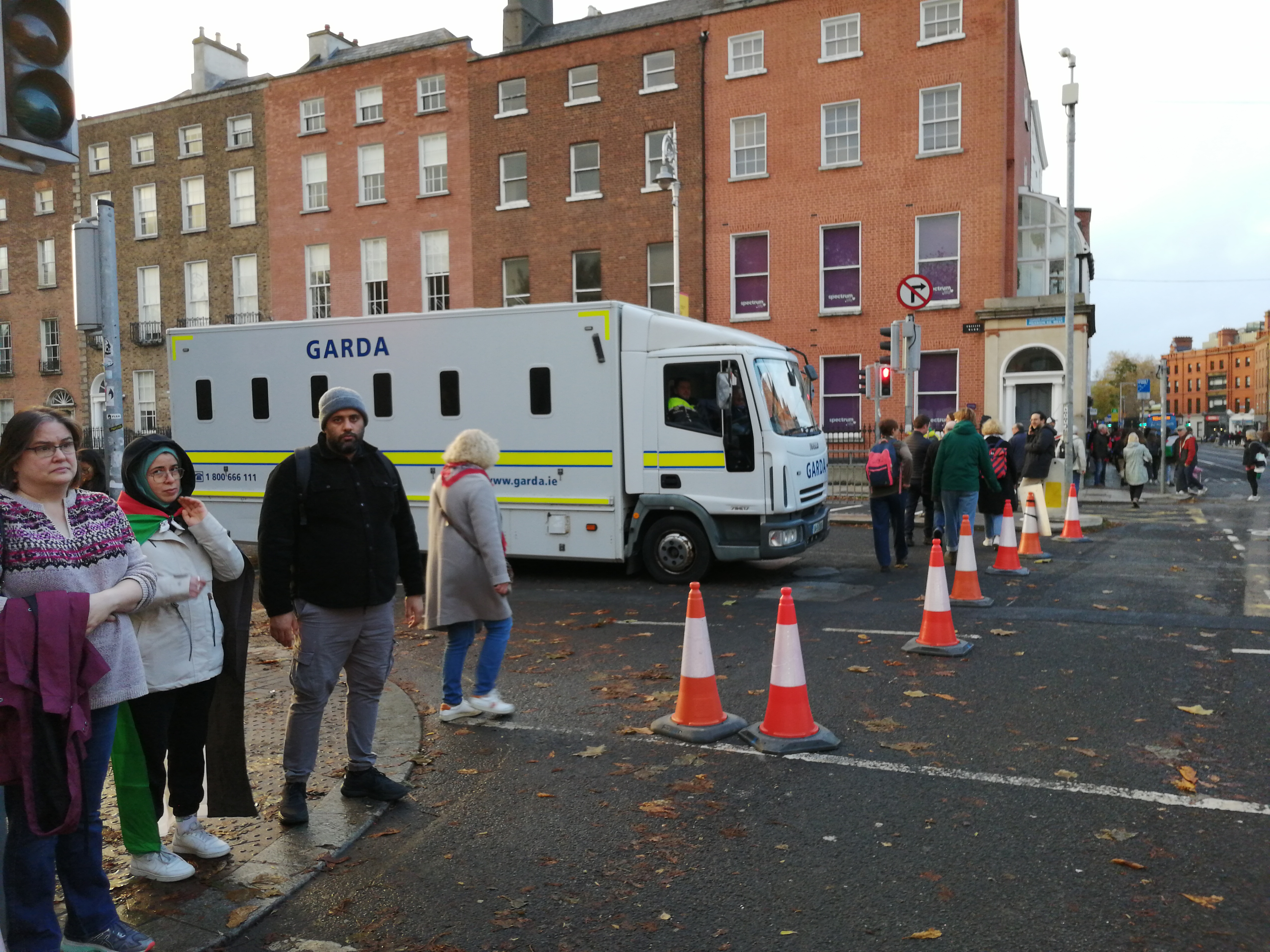 Passing the corner of Merrion Square West, with the former home of the Wilde family on the right, a large Garda prisoner transport was parked at the corner with other police vehicles around and some Public Order Unit police standing around.