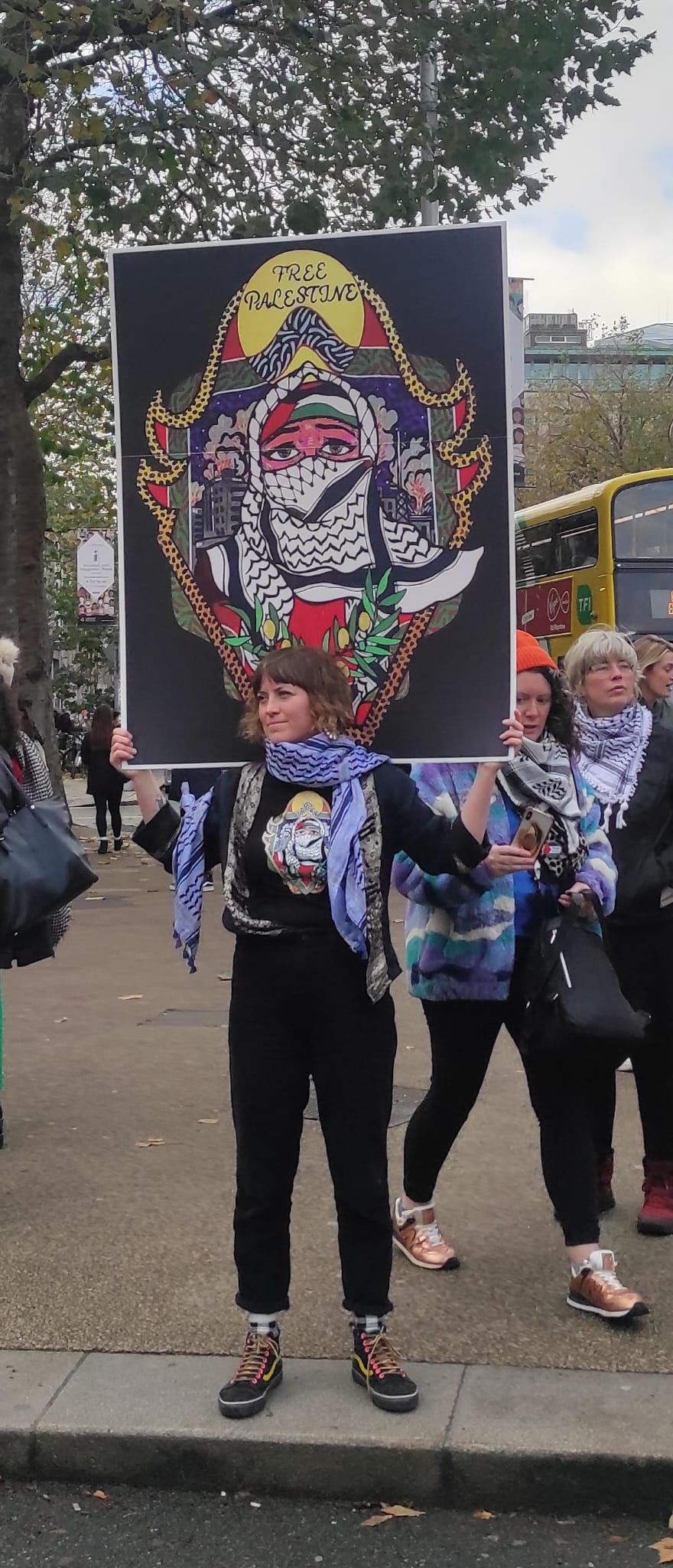 An Ghaeilge, the Irish language, had a presence on the march in a small number of placards and a big banner proclaiming Saoirse don Phalaistín,6 the latter also shouted as a call-and-answer slogan, to merge with the now-familiar ones of Palestine solidarity, along with denunciation of genocide.