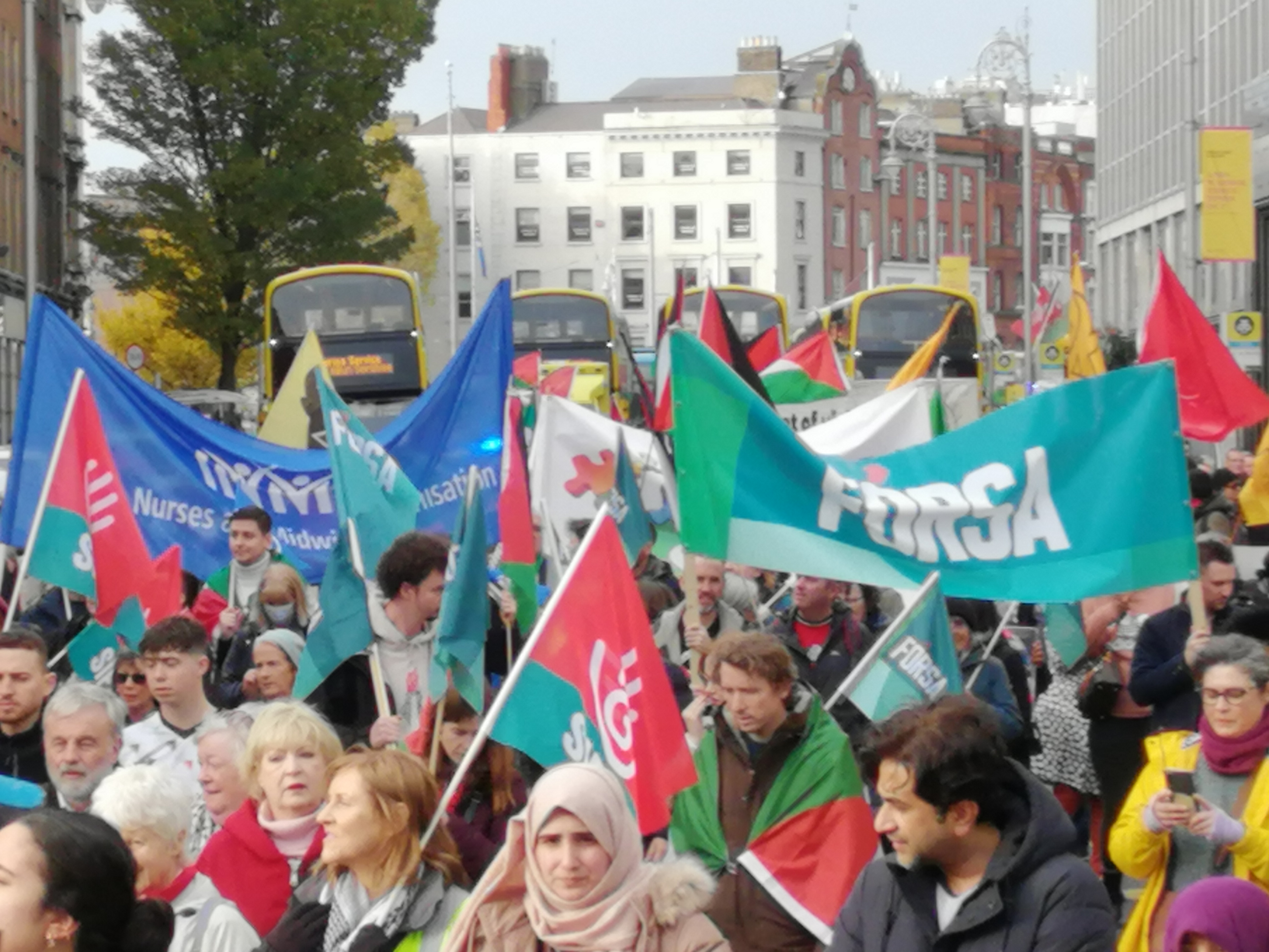 The national march called by the Ireland Palestine Solidarity campaign took nearly an hour to pass through Dublin’s O’Connell Street, Palestinian colours mixing with those of political party or group and some education trade union flags and banners – and the green and gold Starry Plough.1