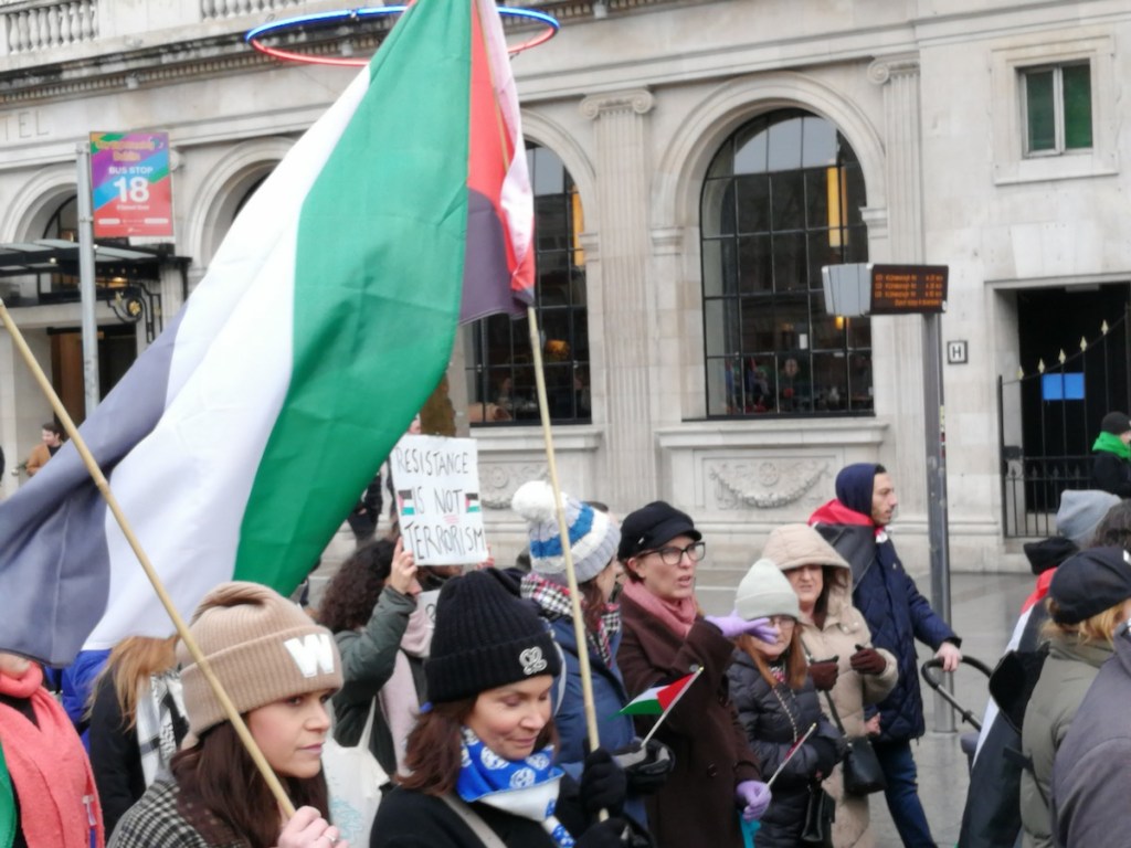 The slogans shouted were for the most part the regularised call-and-answer chants of Palestinian solidarity: Free, free – Palestine! From the River to the Sea – Palestine will be free! In our thousands, in our millions – we are ALL Palestinians!