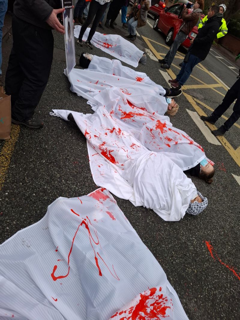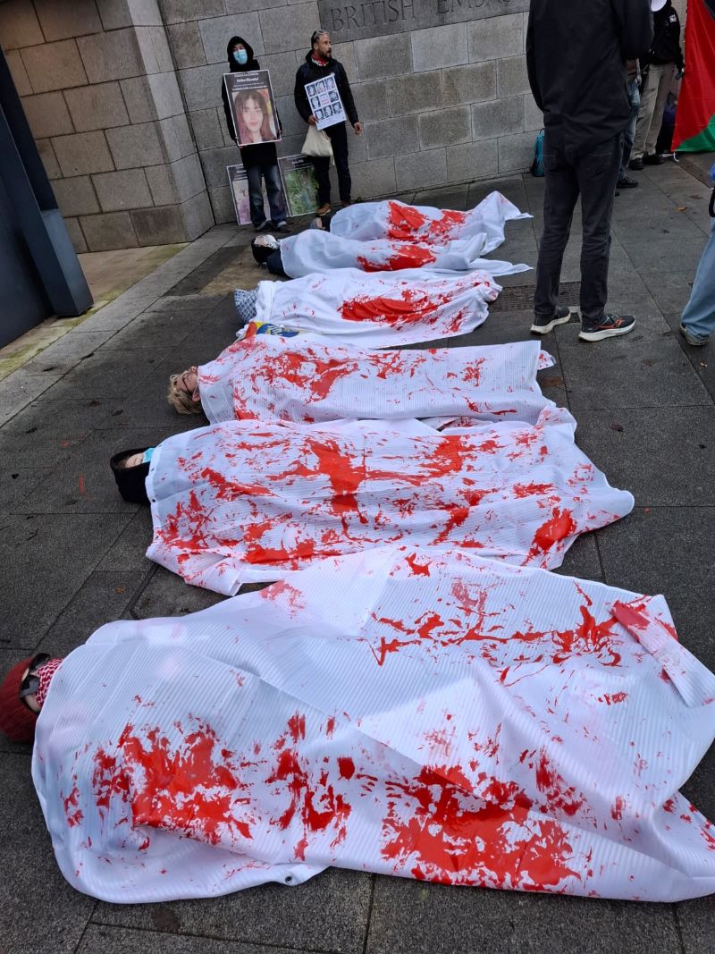 Slogans also castigated British Government collusion in the Israeli genocide, Irish state collusion through militarisation of Shannon Airport and Gardaí collusion through their defence of the British Embassy.