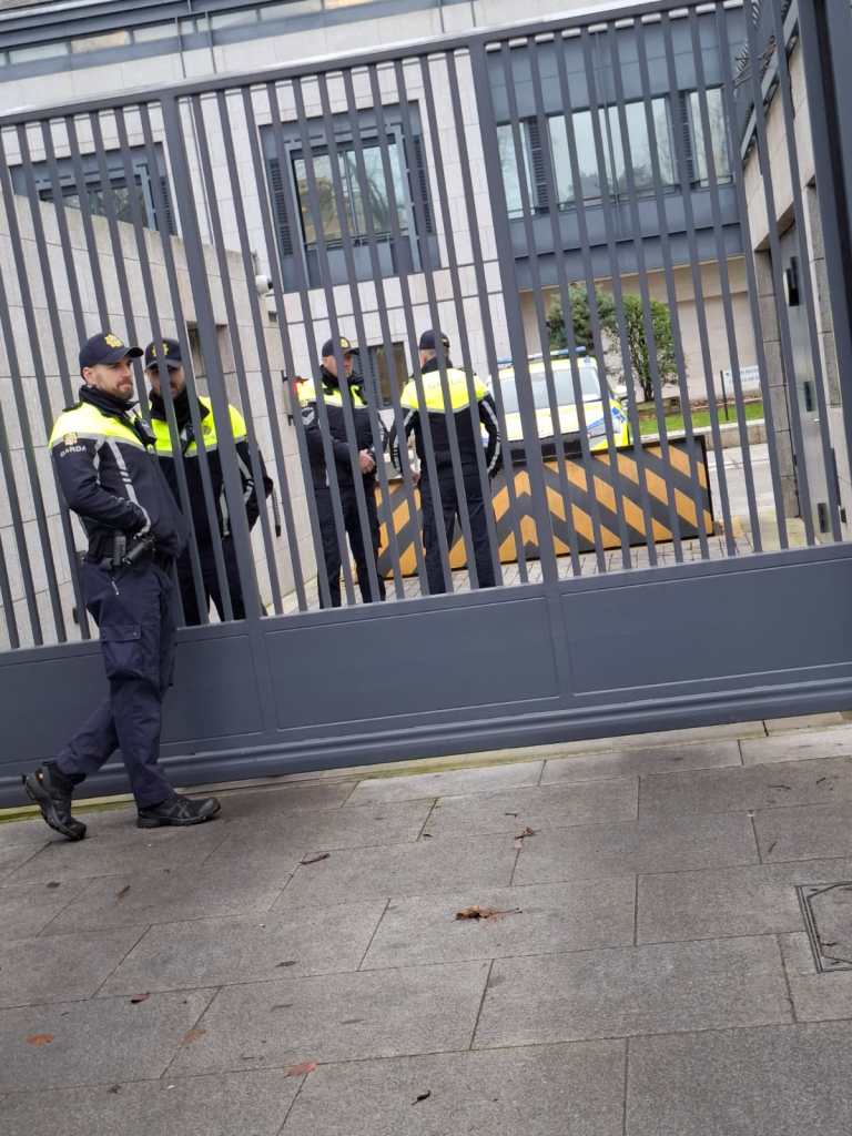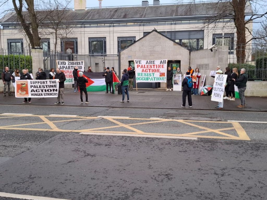There were lively scenes today outside Dublin’s British Embassy in solidarity with the hunger strikers in British jails awaiting trial on charges arising out of Palestine Action’s operations against the Israeli arms company, Elbit Systems UK.