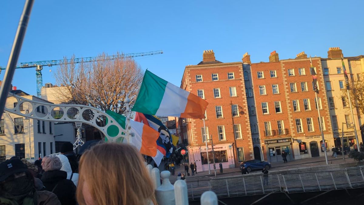 An emergency protest and solidarity demonstration was called for 3pm in the city centre and under a clear blue sky but in bitter cold, many attended to line the iconic Ha’penny Bridge, which only a week ago had hosted a New Year’s Eve demonstration in solidarity with Palestine.