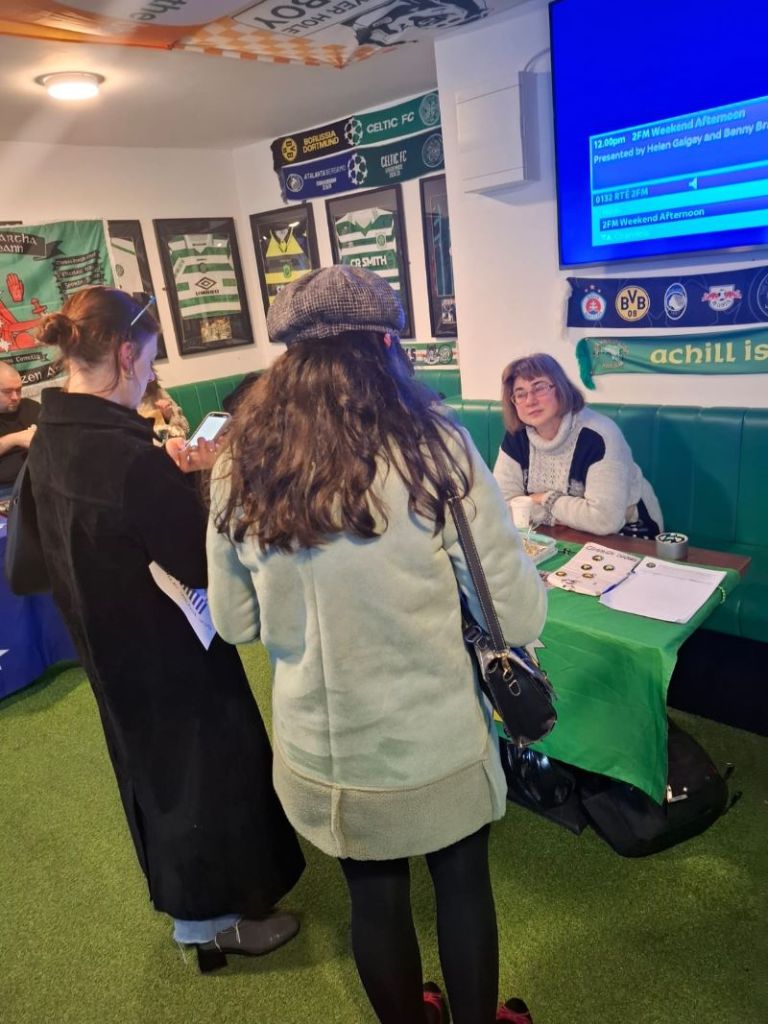 The Comrade Corner’s section of the monthly market take place upstairs in the Peadar Brown’s pub, open to campaigning and community groups to book a table to promote their campaign or group on which they had campaign leaflets, a QR to sign on line and campaign badges.