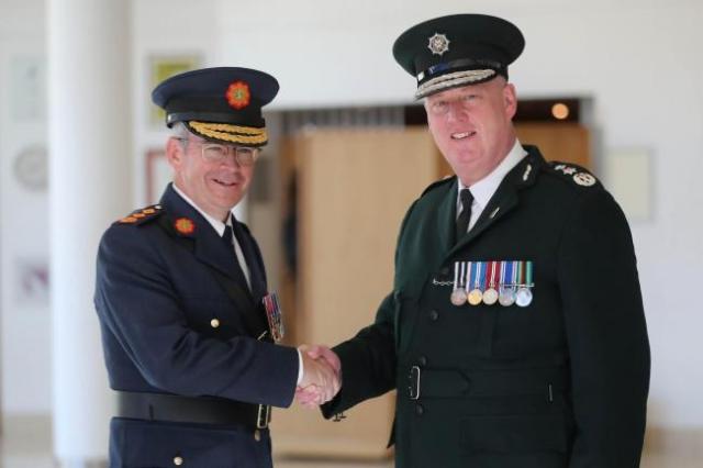 Garda Commissioner Drew Harris being congratulated on his appointment by his former colleague in the PSNI, Asst. Commissioner Hamilton. (Photo sourced: Internet)