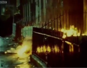 Later that awful day, McKee, Clancy and Clune were reported “shot while trying to escape”. Their captors said that, because there was no room in the cells, they had been placed in a guardroom and were killed while grabbing arms to shoot their captors and to make a getaway. To bolster the Castle’s story, they produced a number of photographs: one shows three civilians sitting apparently in conversation in a room, where a number of Auxiliaries and British Army are also shown relaxed, some eating a meal and another reading. Untended weapons are in view; another photograph shows a blur of men “trying to escape”. In none of the photos are the faces of any of the three prisoners clearly shown.