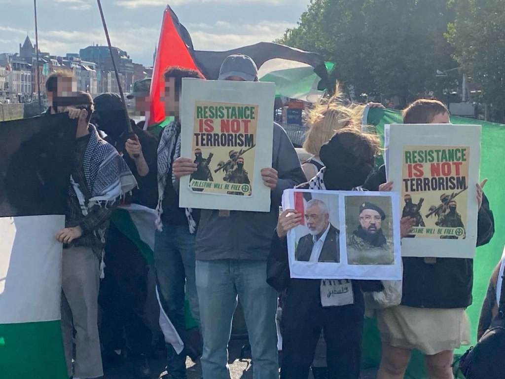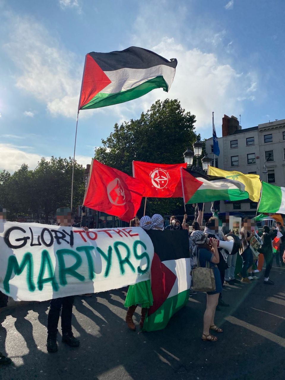 Some carried portraits of martyred Resistance leaders Haniyeh and Fouad; among the usual Palestinian national flags and resistance faction flags, a number of Irish Tricolours could also be seen, along with a green-and-gold Starry Plough.