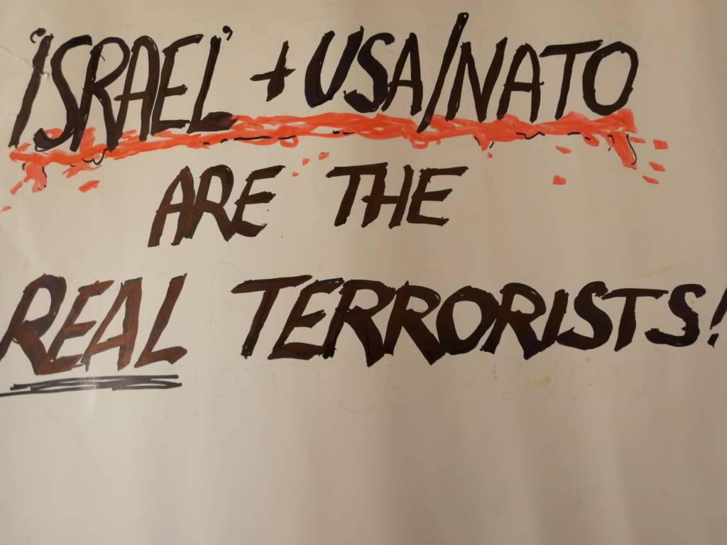 Some printed placards stated that Resistance Is Not Terrorism, while a couple of home-made placards stated that ‘Israel’ and US/NATO are the real terrorists! and a home-made banner declared Glory to the Resistance!