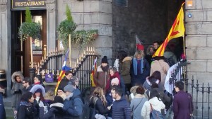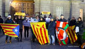 Outside the meeting up to dozen protesters had taken up positions on both sides of the street. On the Trinity College side a couple of protesters stood beside portraits of the Catalan grass-roots activists and politicians who are in jail awaiting sentence or in exile. On the Instituto side, a larger group of protesters held two banners and a Basque Antifa flag.