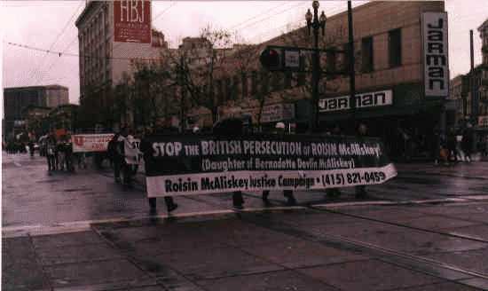 Bernadette’s daughter was arrested twice on the same charge but vigorous campaigning impeded her extradition. Photo shows banner resisting the earlier attempt.