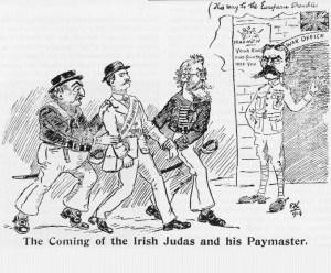 Cartoon in the Irish Worker depicting Redmond as one of a shanghailing part delivering the Irish Volunteers to the British Army. (Image source: Internet)