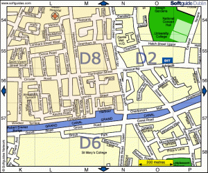 Portobello area map today, Camden Street is a longish one right between the D8 and D2 legends. Pleasant St. is off Camden St. to the left, near the top of the image. (Source: Internet)