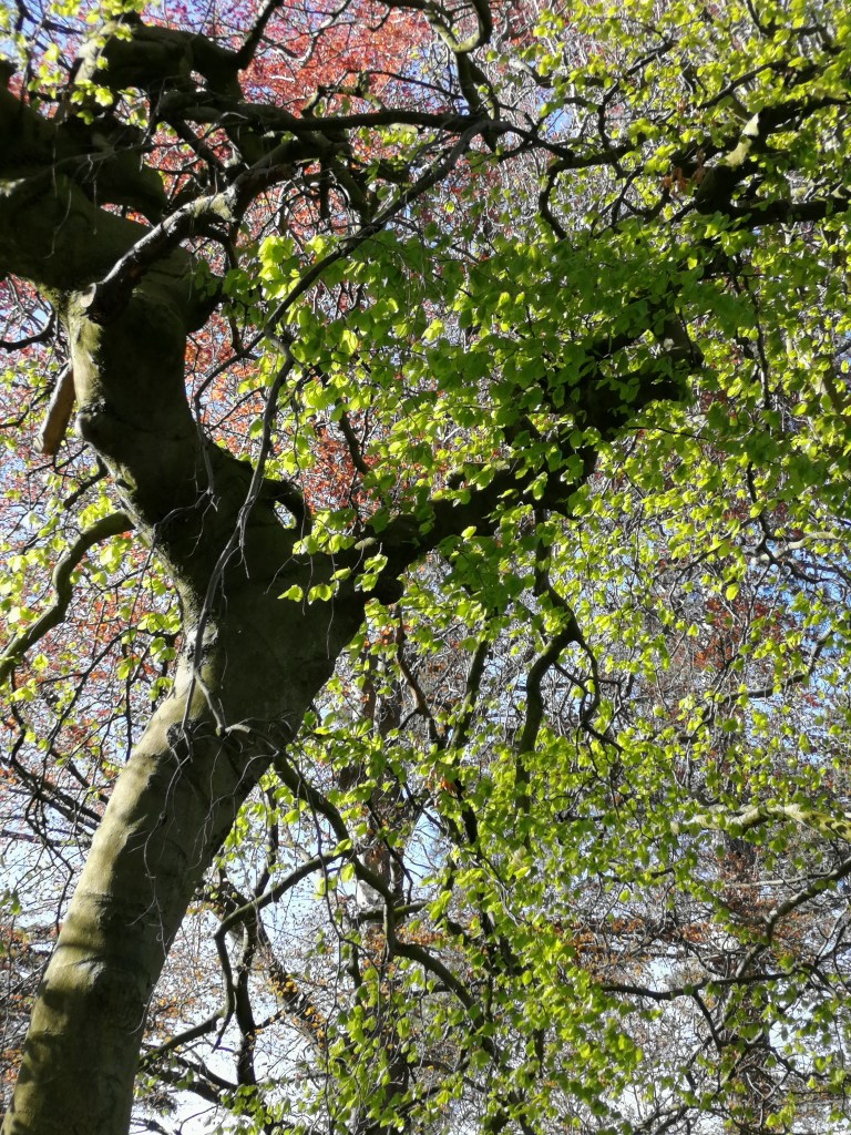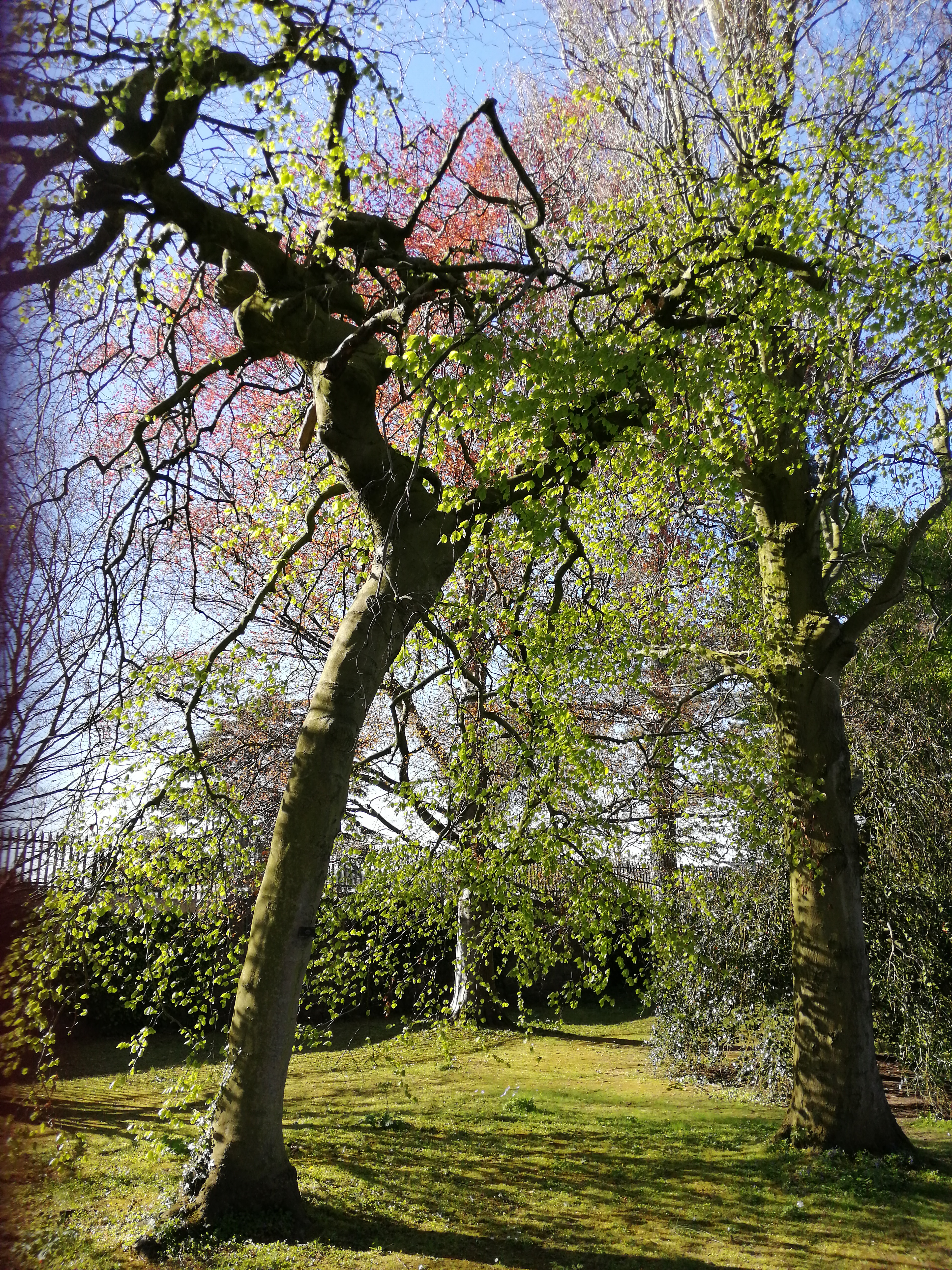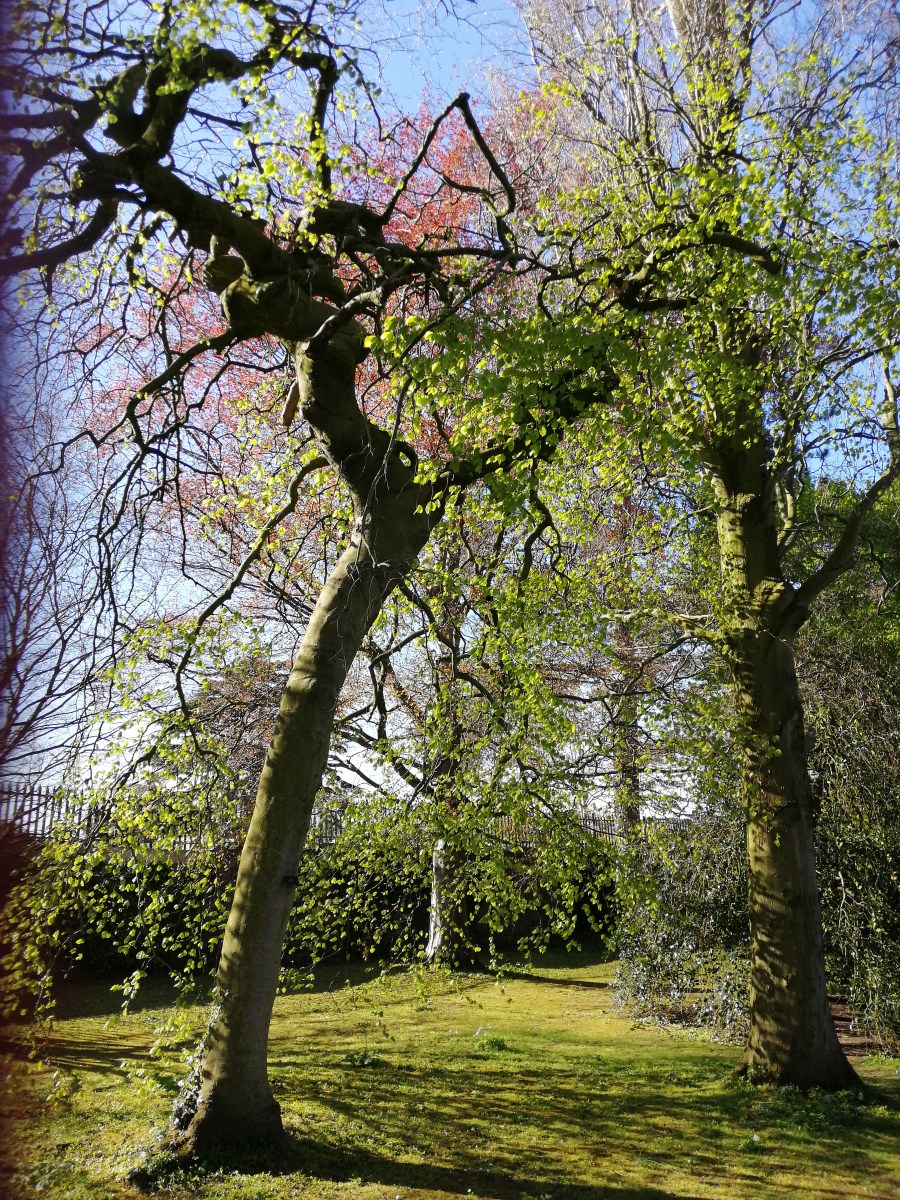 At this time of year, some of the trees are in full leaf, some in early stages and some still bare or just in bud. It is a good time to note the shapes of branches, some seemingly fantastic and also the effect of the emerging leaves against them. The clumps of the parasitic mistletoe (Sú darach) can be seen high in the branches of many species in the Gardens and having spread also to some trees in the Cemetery.