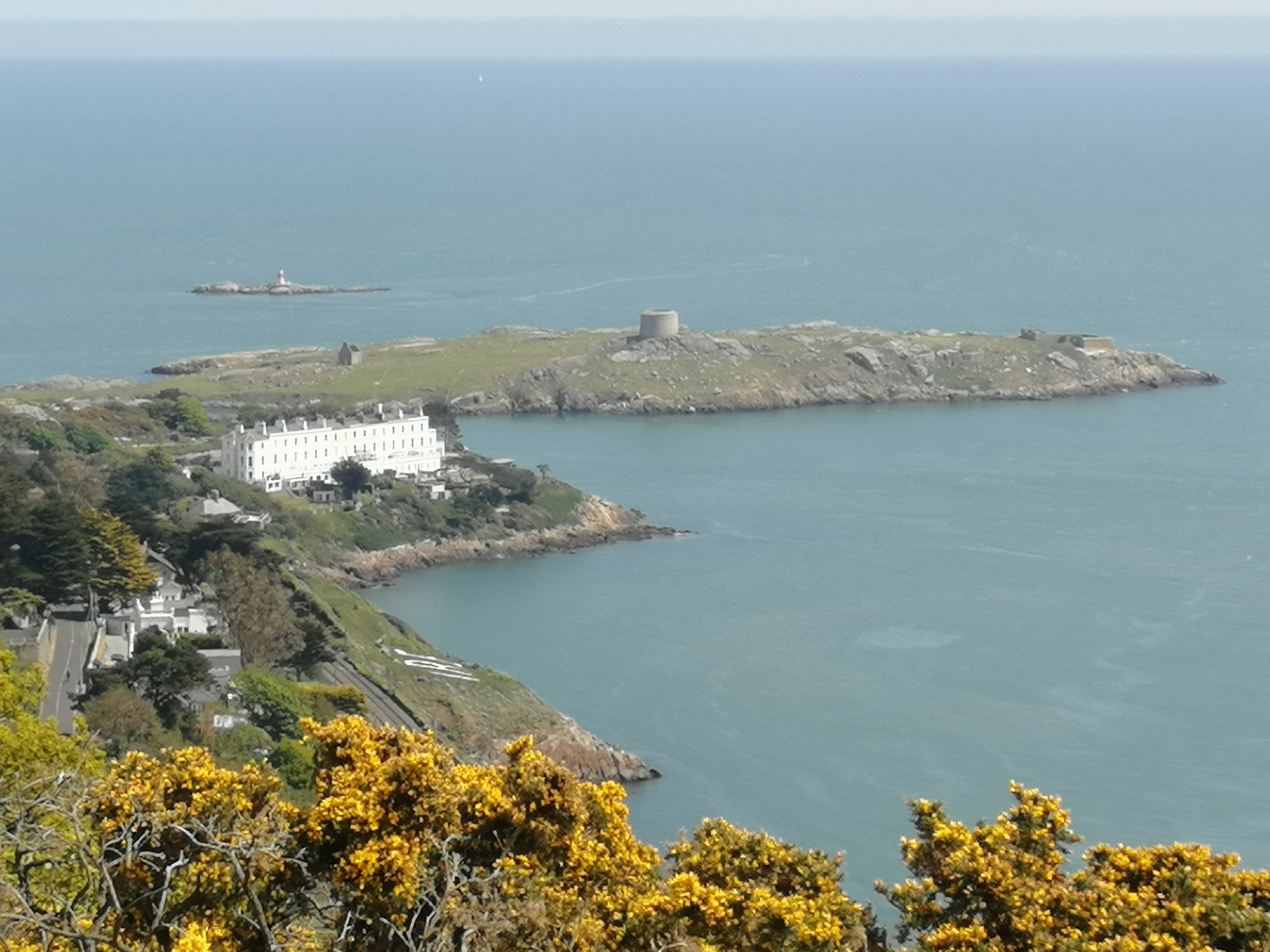 Dalkey Island (Deilg Inis) in the distance from Killiney Hill, gorse (furze – aiteann) in bloom in the foreground (Photo: D. Breatnach)