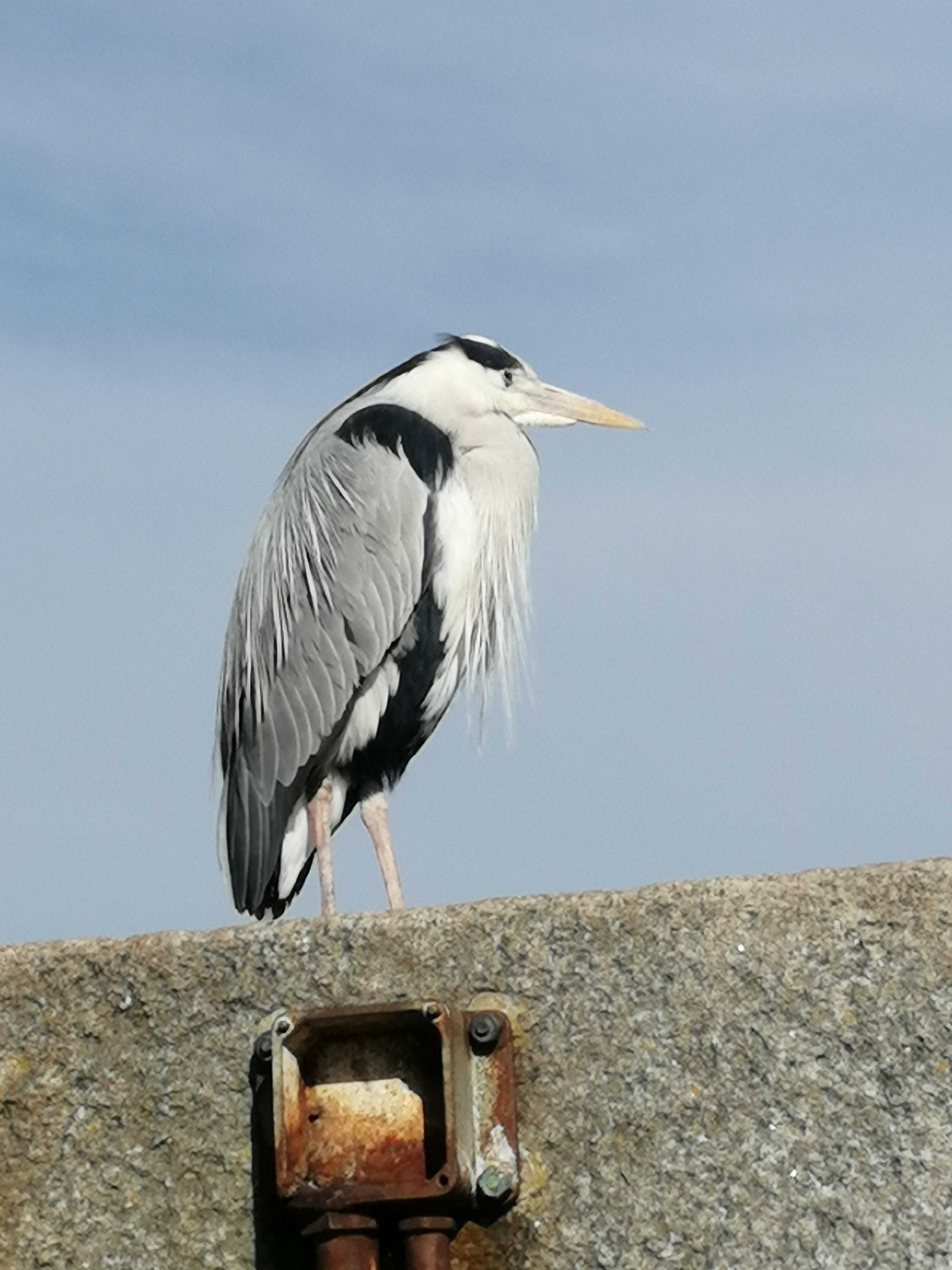 Grey Heron (Corr éisc) on top of the wall at the end of the West Pier — first time I have ever seen one there. He wasn’t too worried about me but was keeping an eye on a couple of dogs wandering around below. (Photo: D.Breatnach)