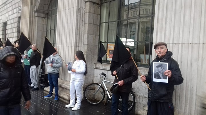 People with black flags and portrait photos of Brendan Hughes outside the GPO building in Dublin marking the 10th anniversary of the freedom fighter’s death. (Photo source: End Internment FB page)