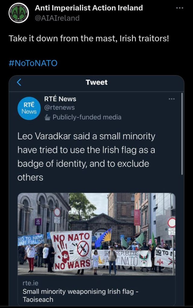 Manifestantes dentro de un patio del Castillo de Dublín contra el Foro Gubernamental sobre Seguridad Internacional celebrado dentro del complejo esta semana. (Foto fuente: Acción Antiimperialista)Tweet del AIA en el que aparece la cadena de televisión nacional RTÉ citando los comentarios ridículos de los líderes del gobierno irlandés sobre la exhibición de banderas republicanas irlandesas por parte de los manifestantes frente a la entrada peatonal principal al Castillo de Dublín en el centro de la ciudad.