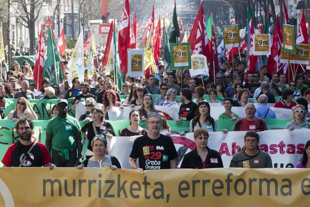 The Spanish state continues to allow its police forces to carry and to fire rubber-coated metal bullets, in particular at protesting Basques and Catalans (see video link at bottom below article). Recently, the EU expressed concern at Spanish police firing at migrants attempting to swim into the Spanish state from Morocco, an occasion when 11 of the migrants drowned. But no international protest criticises them for firing potentially lethal missiles at their own citizens. Police in the Spanish state enjoy impunity and none more so than in the Basque and Catalan countries as well as with regard to African migrants. This week, a motion was put to the Basque Parliament to ban the use of rubber bullets in the area under its control (CAV). Instead a proposal was accepted to “restrict” the use of the missiles to “situations of grave danger” to the police, and to “definitely seek a replacement” for them. The Spanish right-wing PP, the liberal Spanish unionist UPyD, along with the PNV (Basque Nationalists), currently in power, voted for it, along with the Basque version of the Spanish social-democrats, the PSE. The only party to vote against the amendment was EH Bildu, party of the Abertzale (pro-Independence) Left; they had proposed the original motion, seeking a total ban and the removal of the missiles.