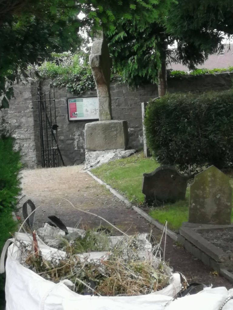 A “meitheal”, a cooperative work party was at work last Thursday afternoon pulling weeds, cutting grass, brambles and ivy. The roots were deep in places and it was clear that site had not been properly tended for a long time. “The ivy is covering the walls of the ruin and gradually damaging them. The church dates from the 10th or 12th Century and the walls should be preserved,” said a member of the local historical society.