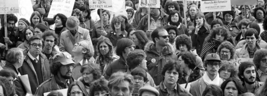 View of students and faculty carrying signs during a strike by faculty and staff of Boston University, on Commonwealth Avenue, Boston, 1979. Historian Howard Zinn, then a professor at BU, is just visible in the centre foreground. (Photo by Spencer Grant/Getty Images)