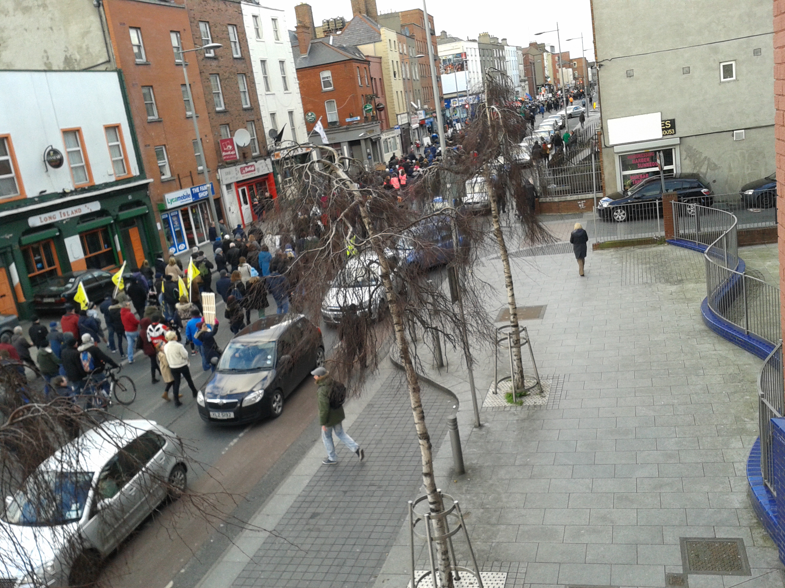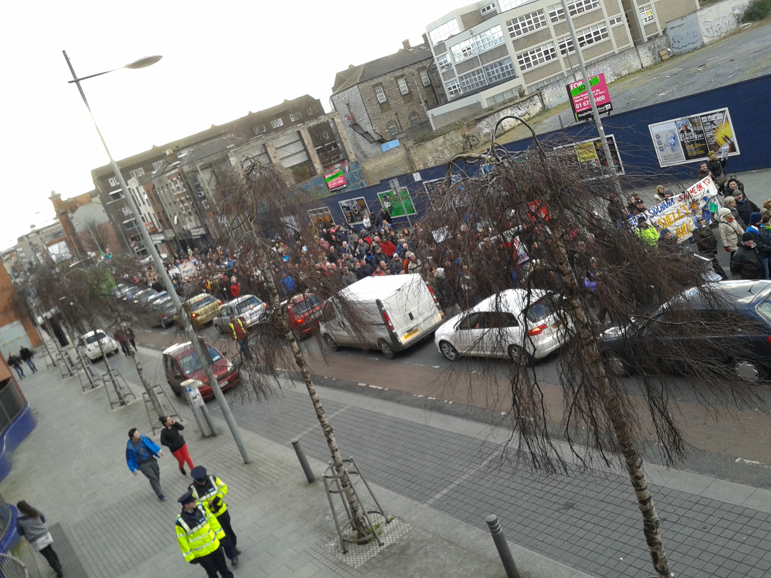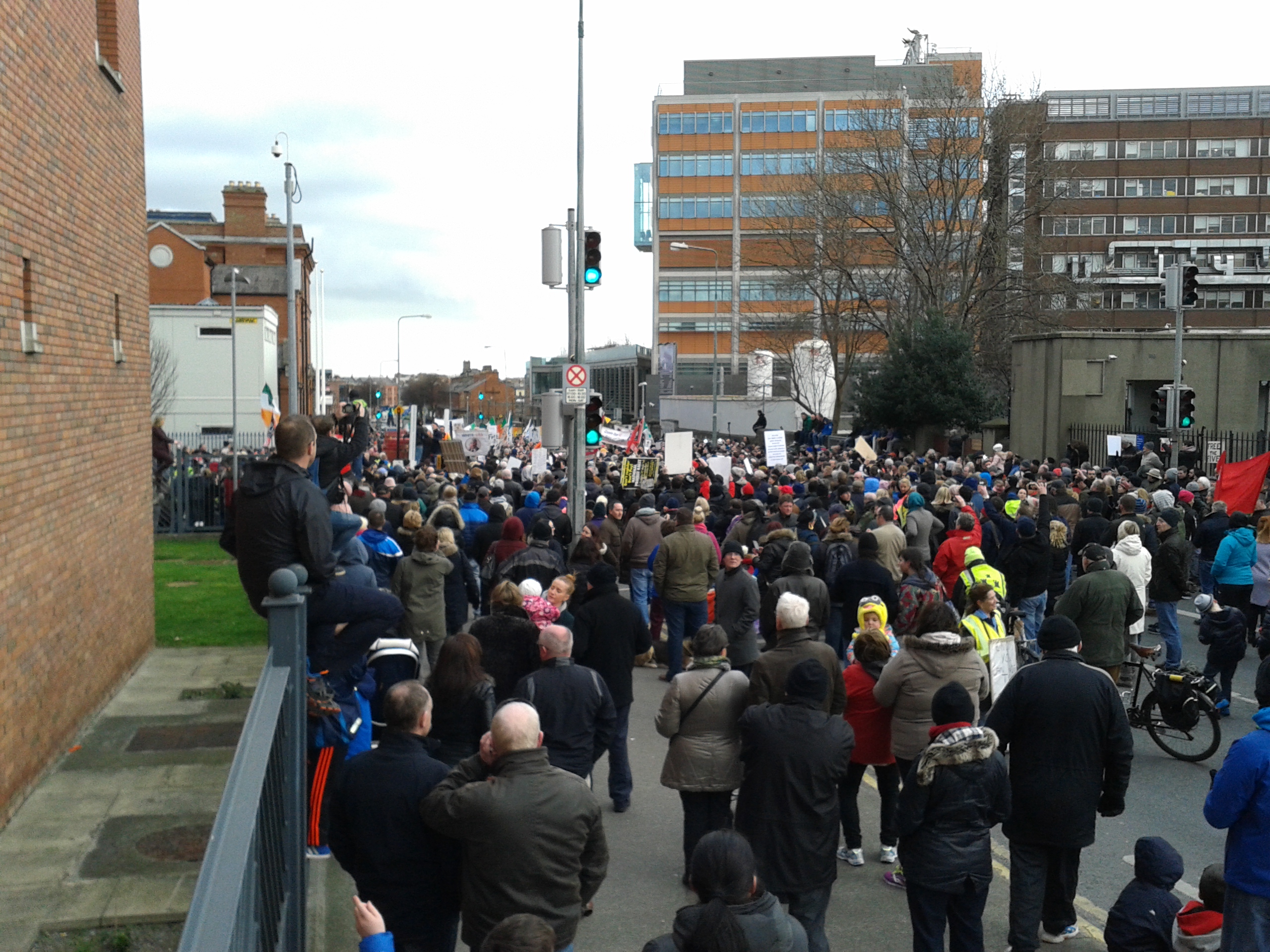 On Saturday 21 February, at two days’ notice, somewhere between eight and ten thousand people gathered in Dublin in solidarity with those water tax protesters jailed by the State and those recently arrested. They marched to Mountjoy Prison and packed the road outside it and in front of the local Garda (police station).