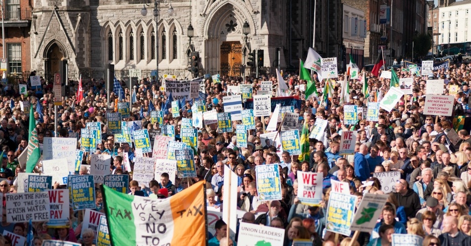 The size of the turnout for the anti-water charges demonstration in Dublin on Saturday 11th of October must have been something of a shock for the Irish ruling class and for their current government, the Fine Gael-Labour coalition. The implementation of water charges forms an important part of their programme to make the ordinary people pay for the crisis caused by financial and property speculators. Other parts of this programme that people have been experiencing to date over the last few years (and including the Fianna Fáil government preceding this one) have been bailing out the banks and their bondholders, financed first through the Household Charge and, after that was defeated by massive resistance, the Household Charge taxed through the Revenue Department; then the pension levy on public service workers; followed by the extensive cuts in social spending at the same time as implementing the “Social Charge”.