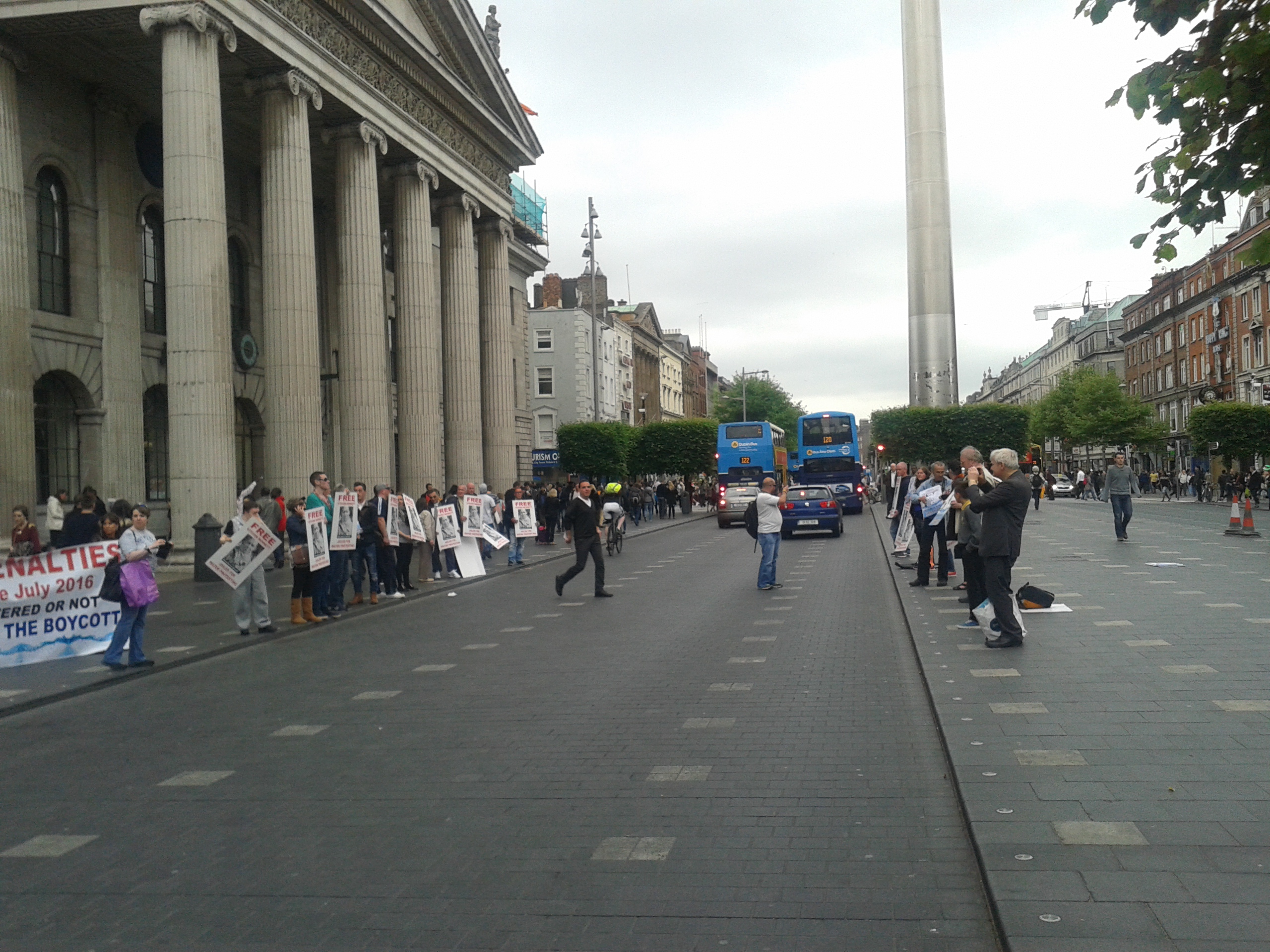 Three lines of protesters in front of GPO, Dublin’s O’Connell Street (view southward), seeking freeing of Steven Bennet (Jim Larkin statue just visible in the background).