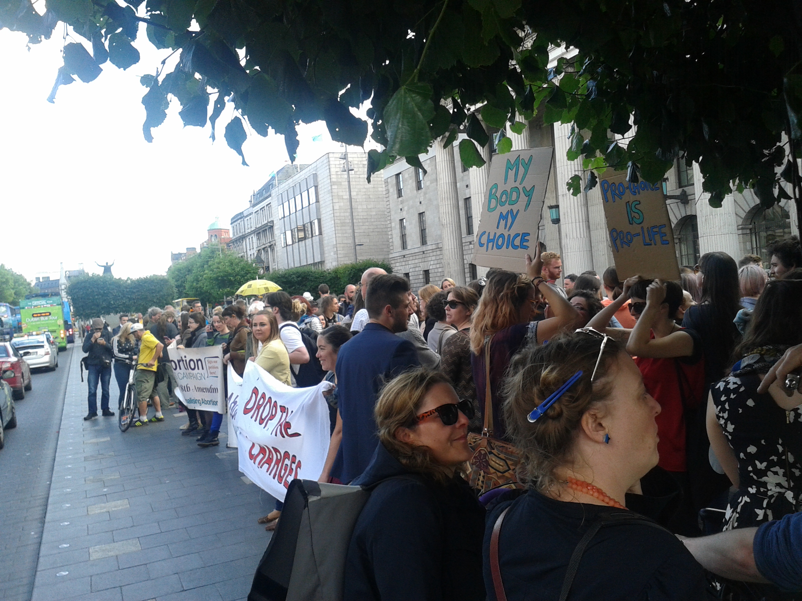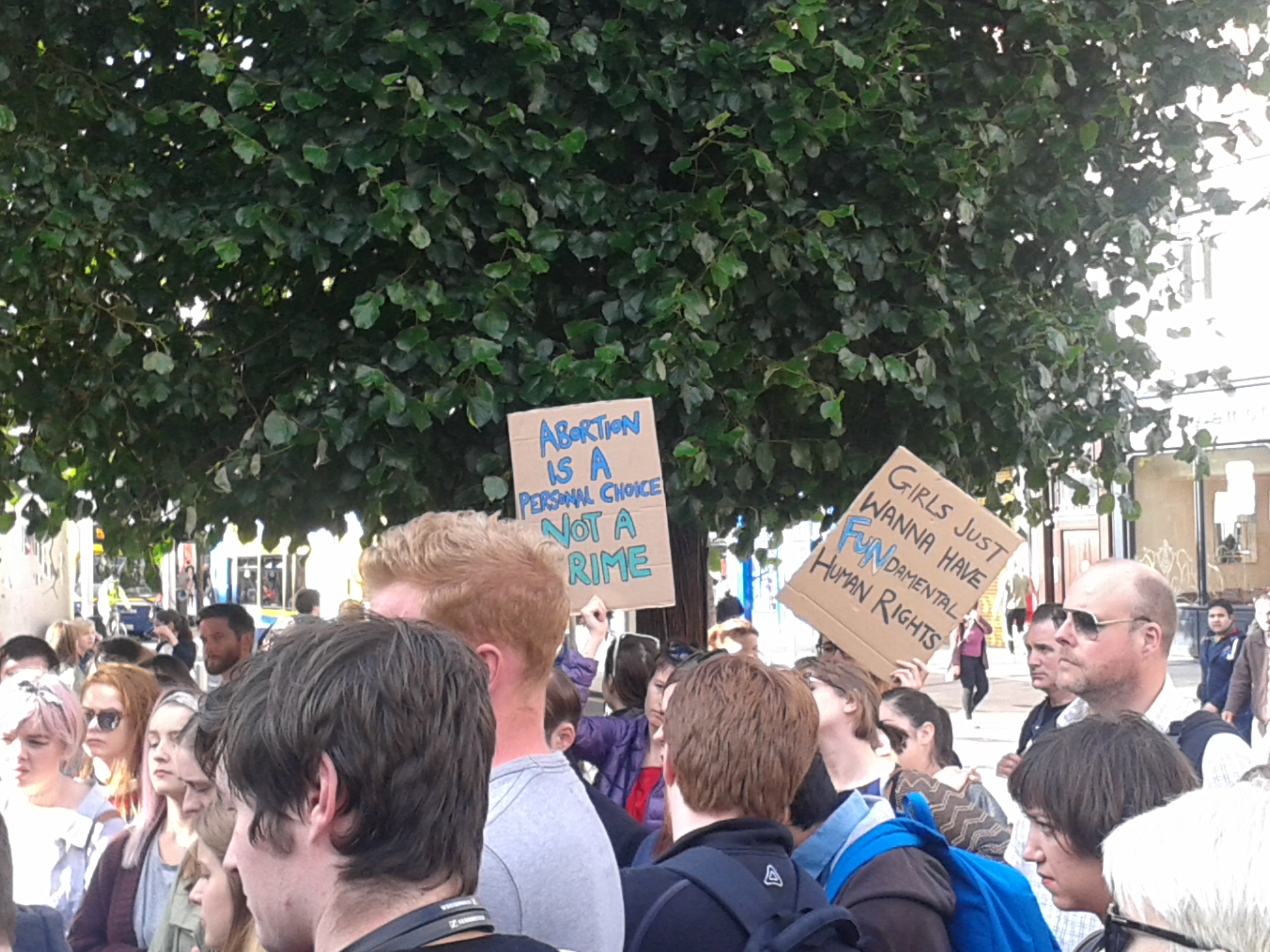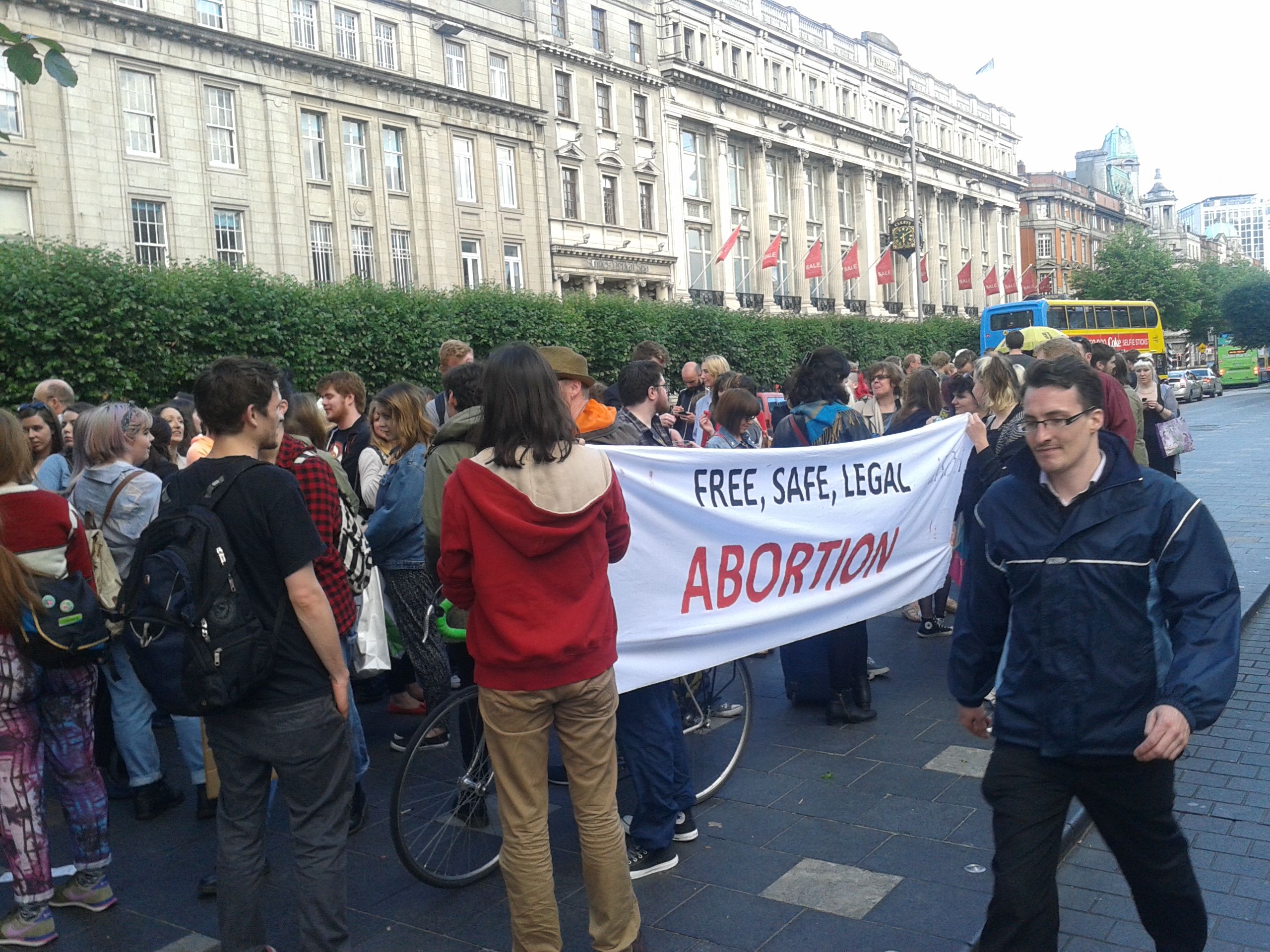 At 6pm this evening a protest took place at the Spire in Dublin in solidarity with a Belfast mother who facing criminal charged for having given her daughter a pill which induces abortion in very early pregnancies. The pill is freely available in Britain and legal there but the 1967 Act which legalised abortion in Britain has not been enacted in the Six Counties.