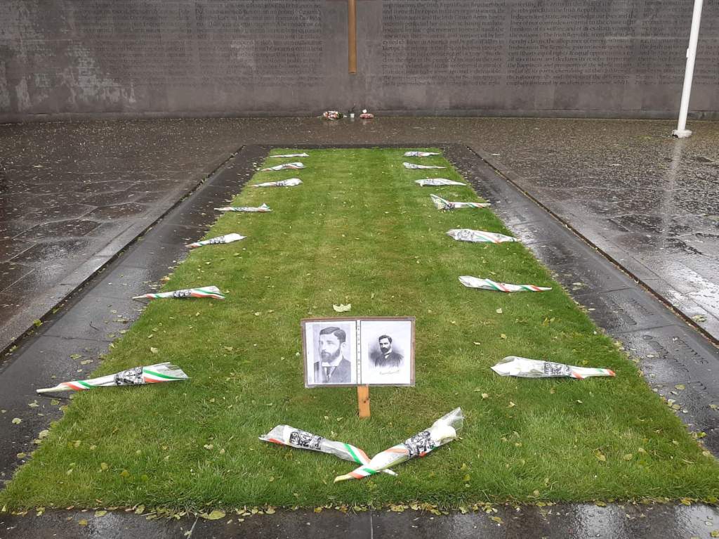 On a gloomy wet and windy day today, Republicans and other anti-imperialists held a commemoration in Dublin’s Arbour Hill of the 14 executed martyrs in Dublin and the remaining two: Thomas Kent shot in Cork and Roger Casement hanged in Pentonville Jail, London. A heavy downpour interrupted the speaker but the event resumed after the cloudburst eased off though it was still raining. Sixteen lilies were laid on the grave patch and a song was sung that named seven of the martyrs, the signatories of the Proclamation.