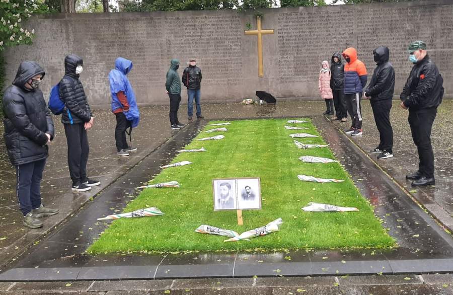 Some of the attendance in Arbour Hill, 3rd May 2021, standing in homage to the 16 executed 1916 Martyrs, 14 of whose bodies were buried in a quicklime pit (located underneath the green stretch. (Photo from AIA with thanks)