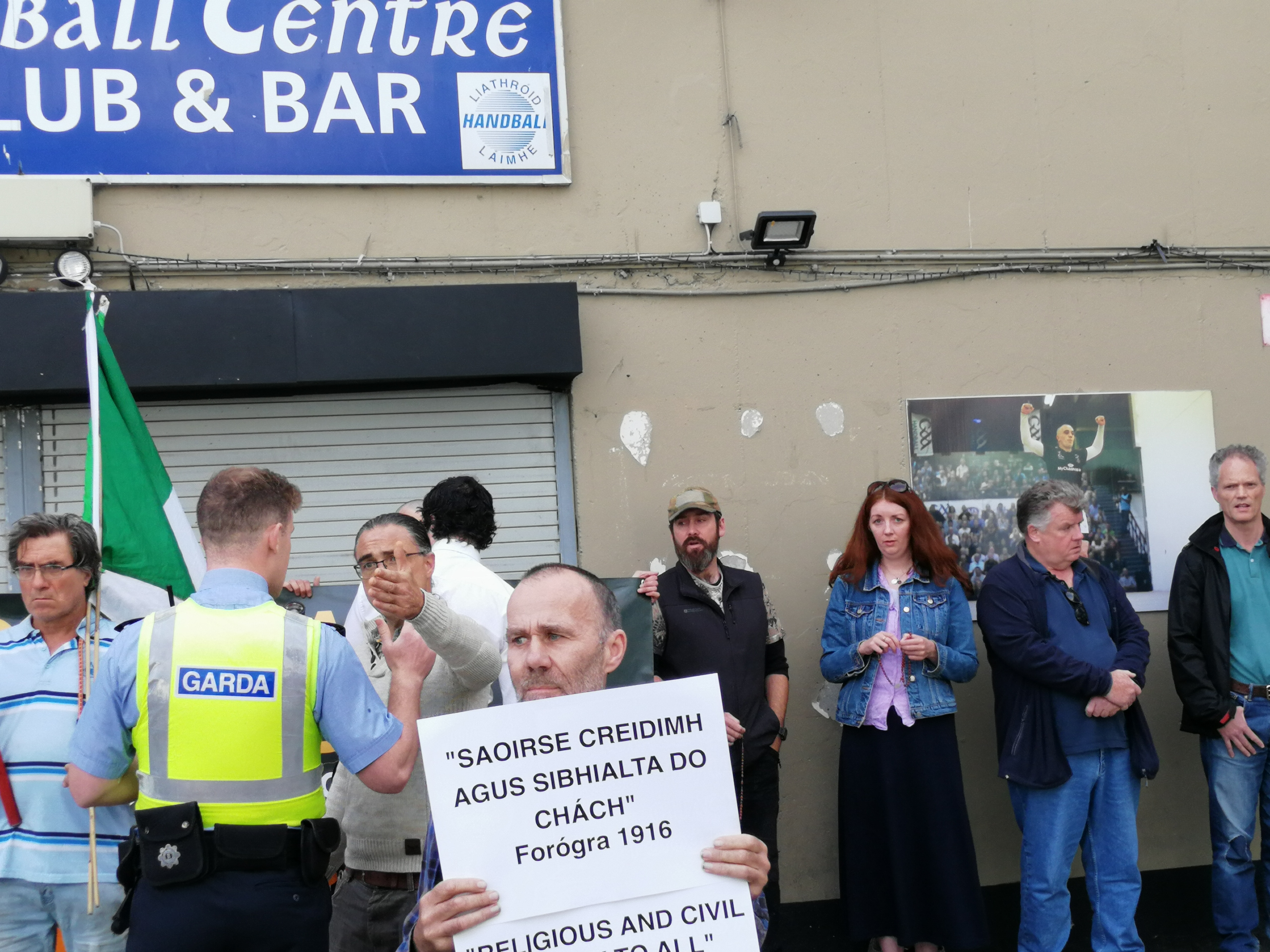 Dublin Republicans Against Fascism organised a counter-protest and attended with placards in Irish and in English quoting from the 1916 Proclamation2“The Republic guarantees religious and civil liberty to all” and also chanted those words at the fascists.