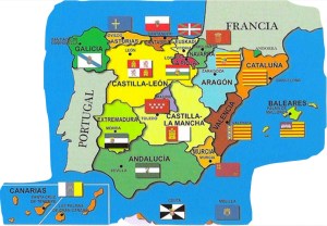 Regions/ nations of the Spanish state (image source: Internet). Note the northern band of possible independist nations from Galicia in the west to Catalonia in the east. Note also the Paisos Catalans regions taking up most of the western coast of the Peninsula from North to South. (Image source: Internet)
