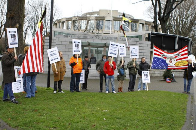 Part of the gathering at the Dublin US Embassy in solidarity with Peltier and seeking his urgent release in 2012