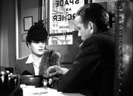 Film ‘Noir’: Still photo from opening sequence of the film production (1941) of Chandler’s novel The Maltese Falcon. Typically, the ‘hard-boiled’ private detective is in his pokey office and the heterosexual male’s ‘sex interest’ has already arrived to ask for his help. (Image sourced: Internet)