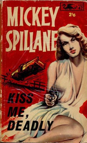 Cover for a Mickey Spillane novel, Kiss Me Deadly (pub. 1952), this one showing the iconic ‘femme fatale’, holding a gun but dressed in bodily-revealing attire. (Source: Internet)