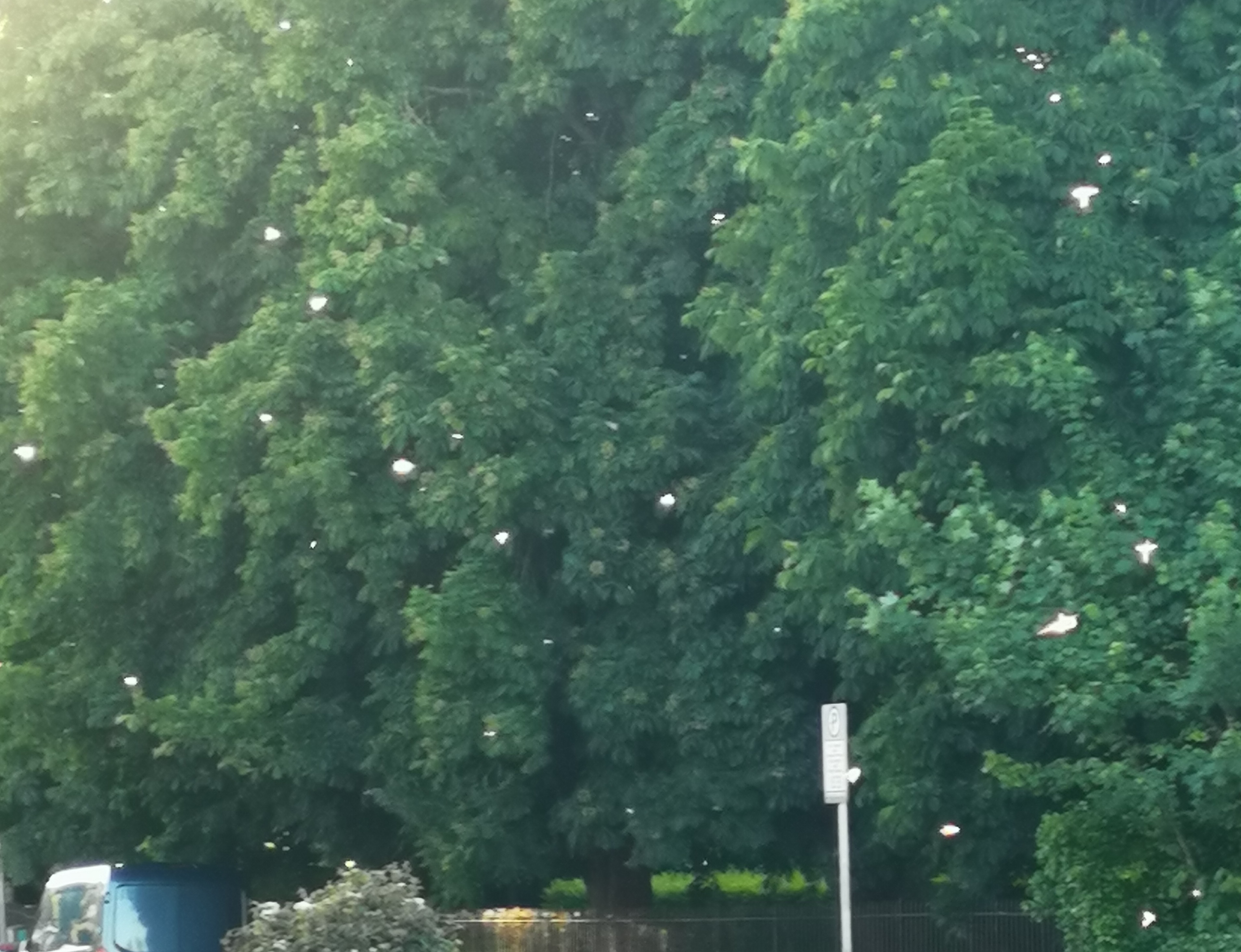 What seems to be snowflakes is my phone camera catching the sun flashing off mayflies dancing over the road in Drumcondra/ Glasnevin (Photo: D.Breatnach)