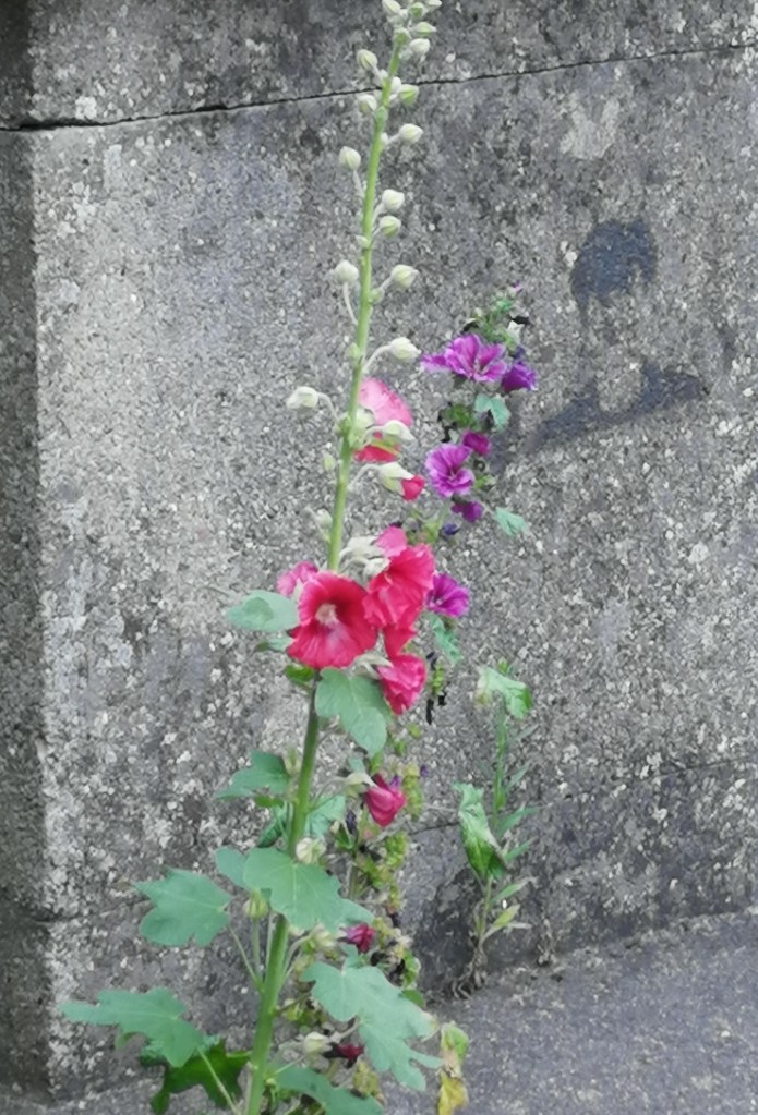 Hollyhock in foreground and looks like another behind it — NOT a native plant. There were some growing each end of the bridge, as though planted or sown there. (Photo: D.Breatnach)