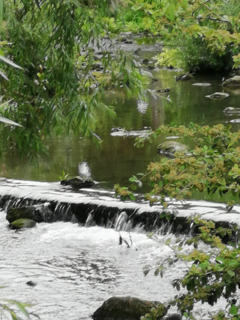 Casadh sa tsruth — a bend in the flow — and view up from the weir. Willow trees on the right and a shrub I know to see but have not identified (a Skimmias?) on the right. (Photo: D.Breatnach)