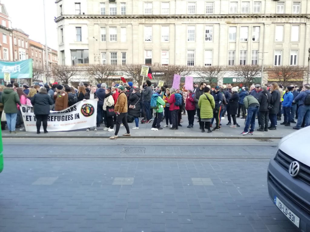 The pro-refugee event gathered on the central pedestrian strip on Dublin City centre’s main street, O’Connell Street, across the road from the iconic General Post Office, the building which served as the HQ of the 1916 Rising. Numerous placards and banners could be seen there.