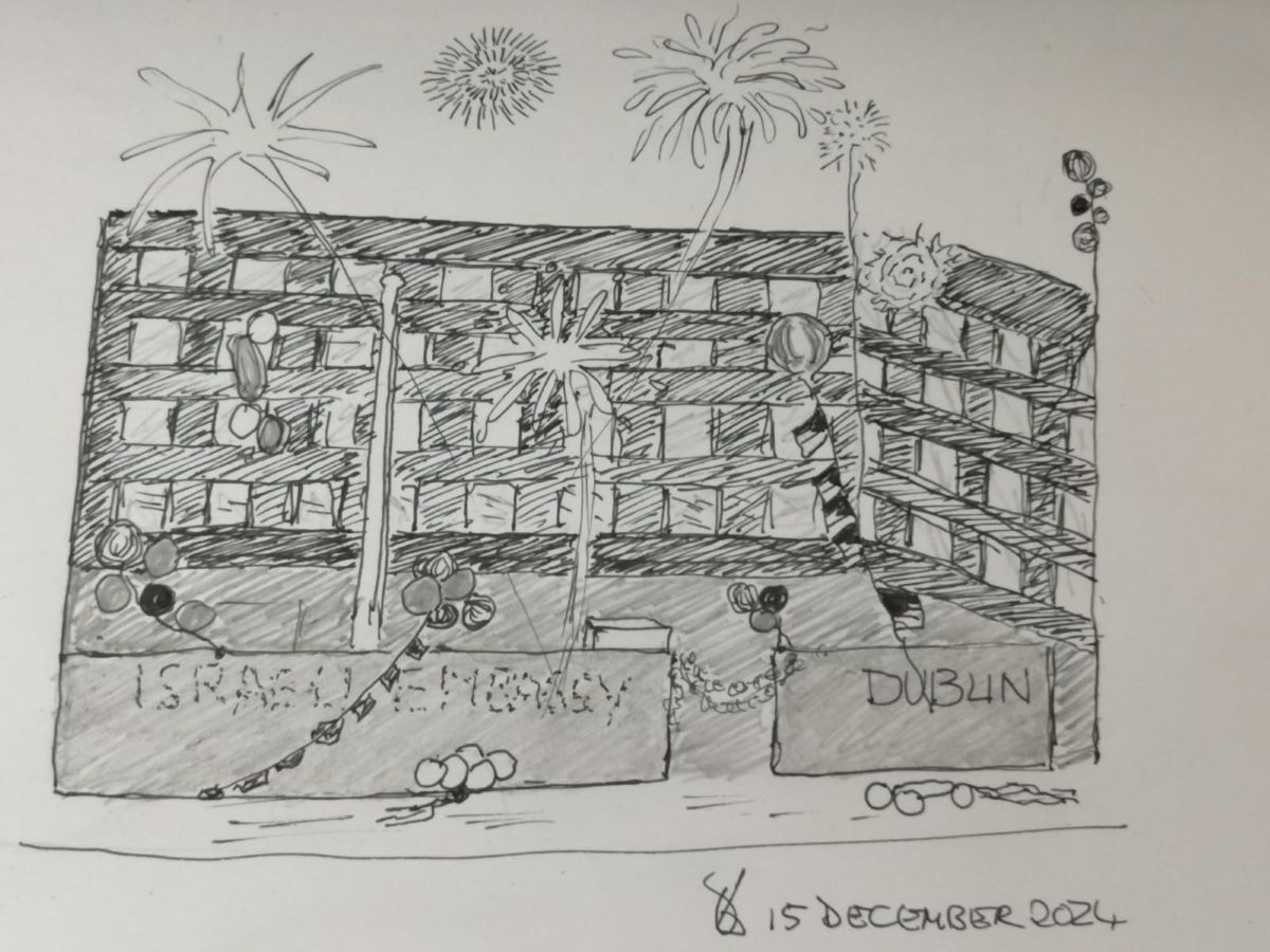 D.B cartoon drawing of celebrations outside the block in which the Zionist Embassy was located (and under 24-hour Garda protection). Many of the other users of the building will be relieved at the departure also.