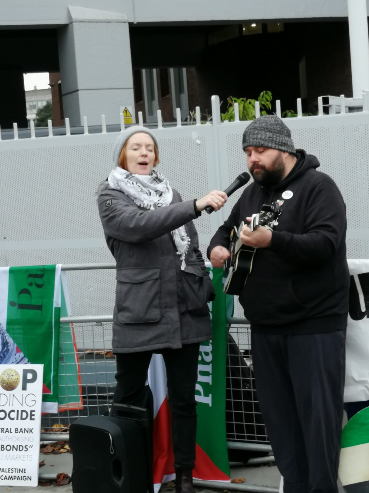 Jimi Cullen yesterday performing his composition “We Are All Palestinians” during a modest celebration outside the Zionist Embassy. Cullen has been performing outside there for an hour every Wednesday afternoon for 41 weeks. (Photo D.Breatnach)