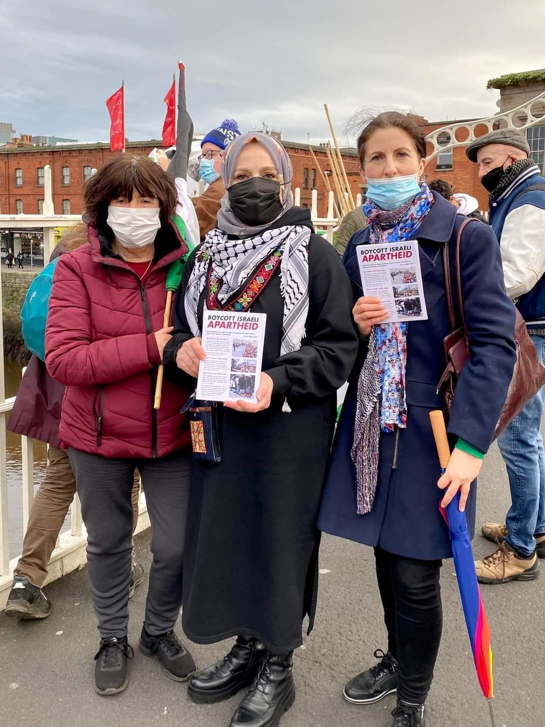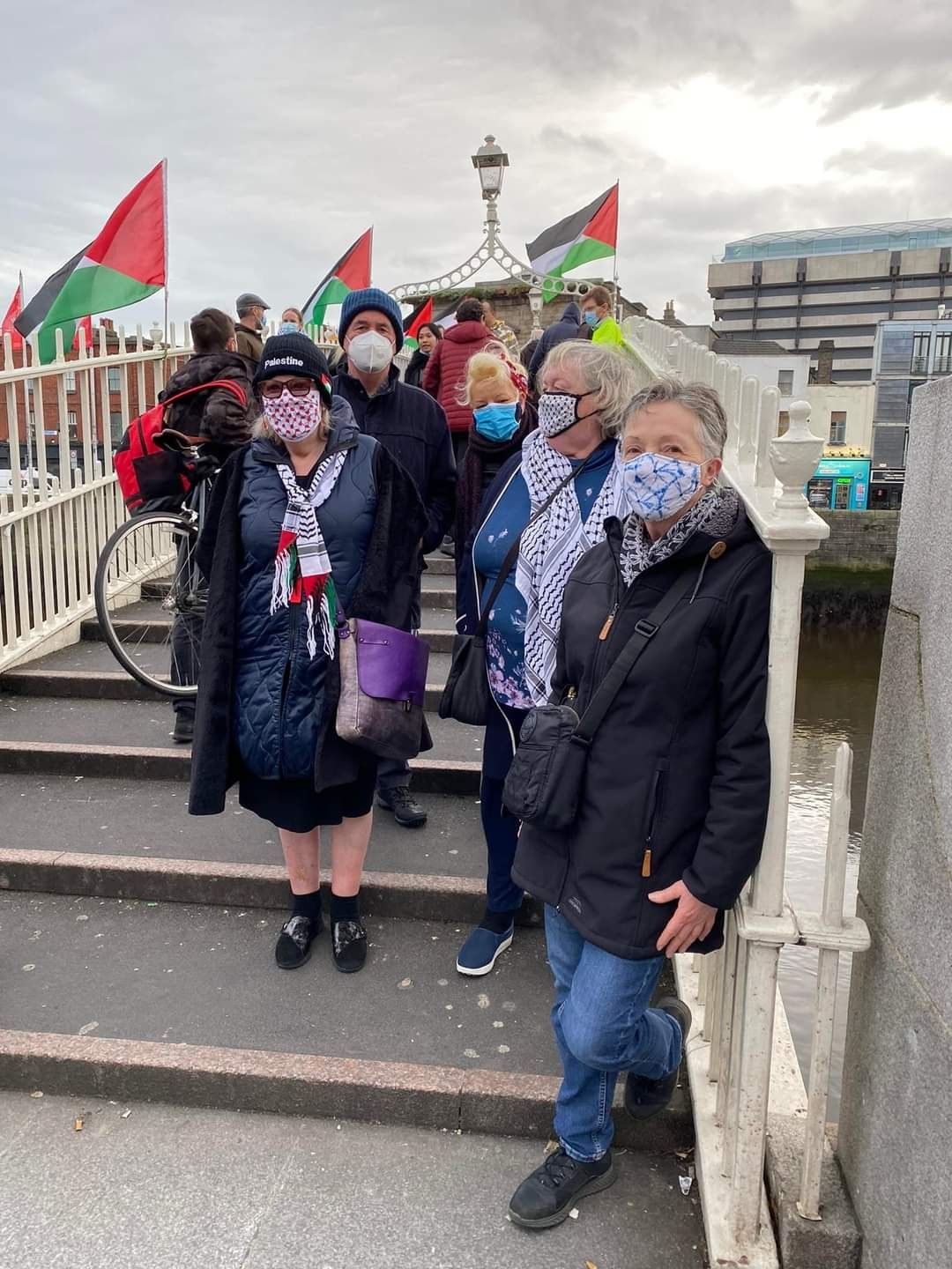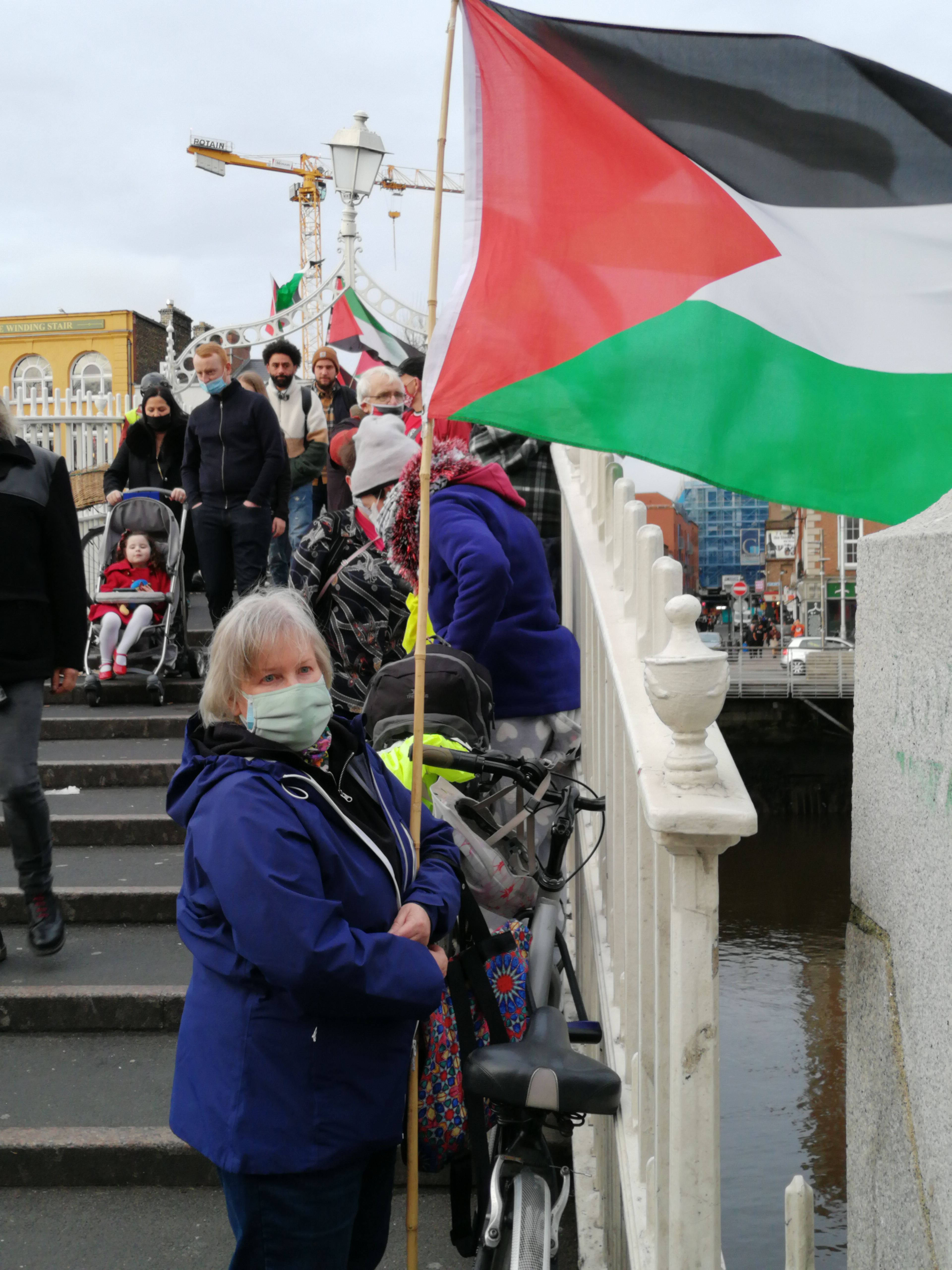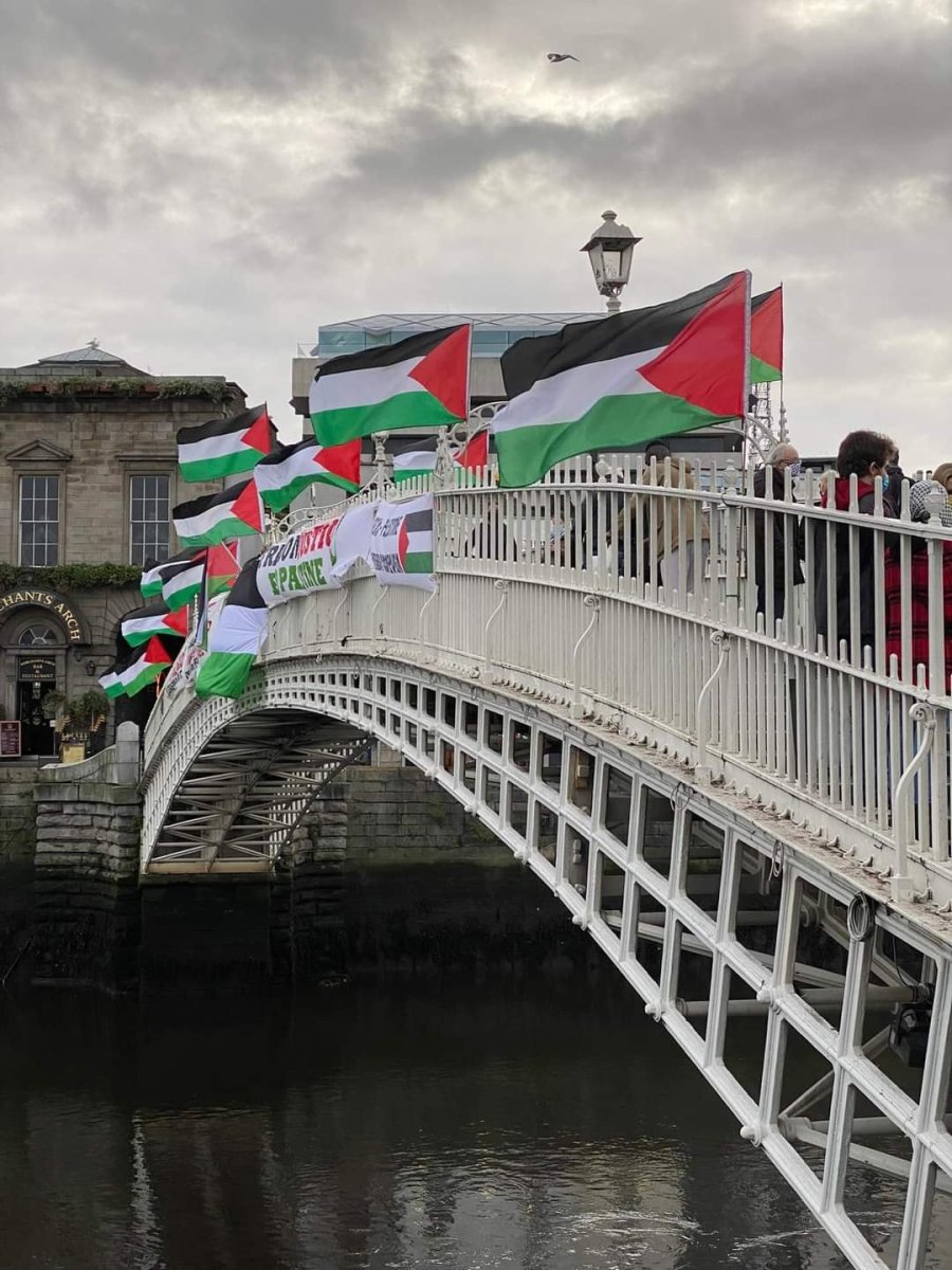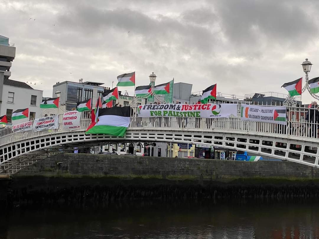 Palestinian flags fluttered in the breeze over the iconic Ha’penny Bridge in Dublin City centre, while banners festooned its length on New Year’s Eve. The numbers were down from previous years, more likely from the soaring Covid19 infection rate than from any lessening of the long-running Ireland solidarity with the oppressed Palestinians. This was ironic since, unlike previous years, this was not a rally braving sleet, snow, rain or icy wind – in fact, the very mild weather raised only the amount of breeze necessary to set the flags fluttering.