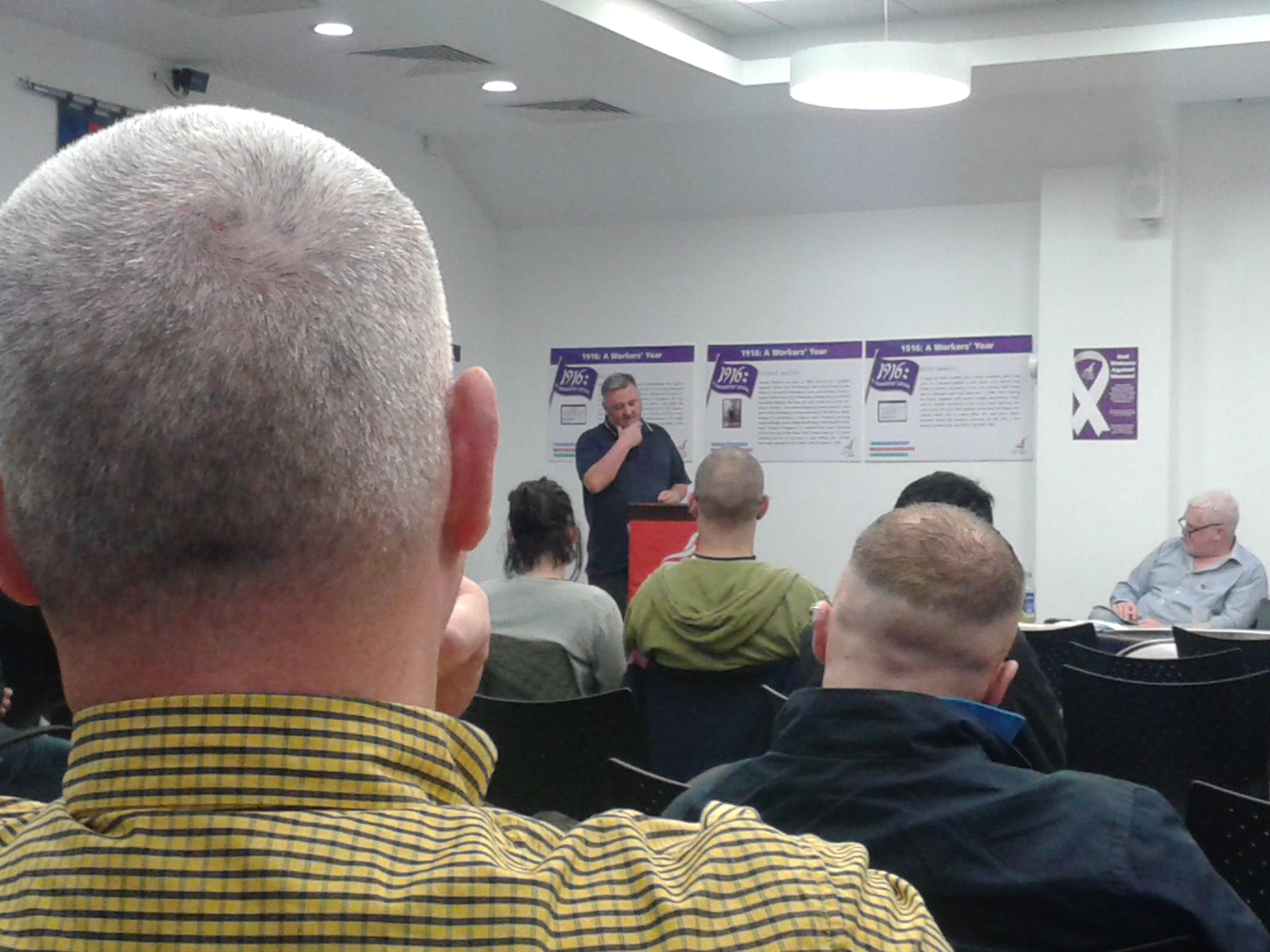 Hanley packed all that into 45 minutes with apparently occasional deviations from his notes, full of interesting observations. Locating the thrust towards fascism in the strongly Catholic and anti-communist atmosphere of the 1930s in Ireland (with elements of anti-semitism), it was surprising to hear excerpts from speeches and right-wing periodicals of the period referring to the Fianna Fáil Government as “communist” and “under orders from Moscow”. It was interesting too to hear brief accounts of pitched battles between fascists and Republicans around the country during the height of the Blueshirt era, how much of a social base and energy the latter gave to the Fine Gael party and to accounts of the Soldiers’ Song (the Irish National Anthem) being attended to with the fascist salute (which led to violence in one cinema at least). Another interesting if somewhat disappointing snippet was that the AT&G, a trade union with HQ in Britain, was the one that most prominently took a stand against Franco in the 1930s while many Irish union leaderships took the opposite side.
