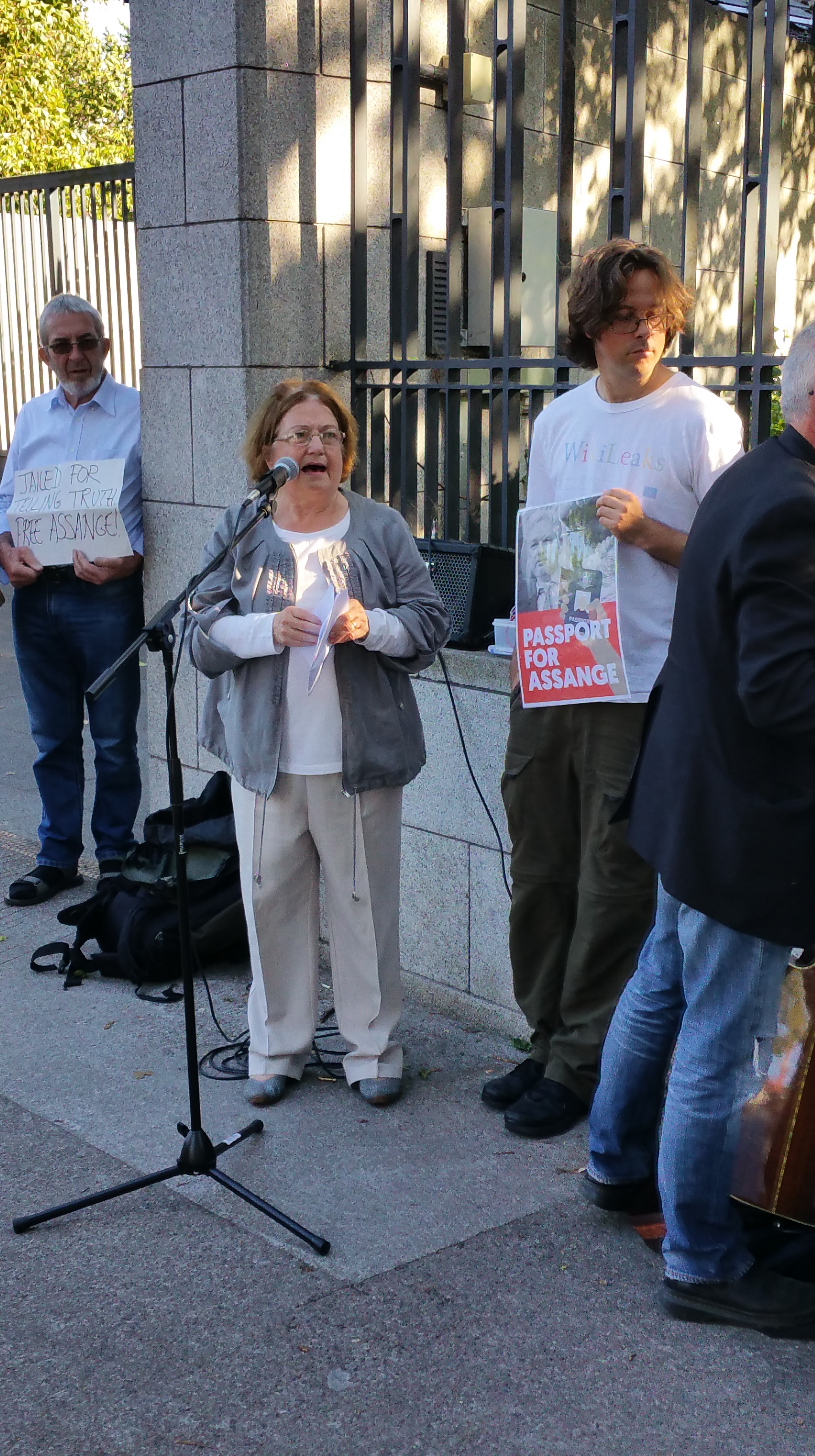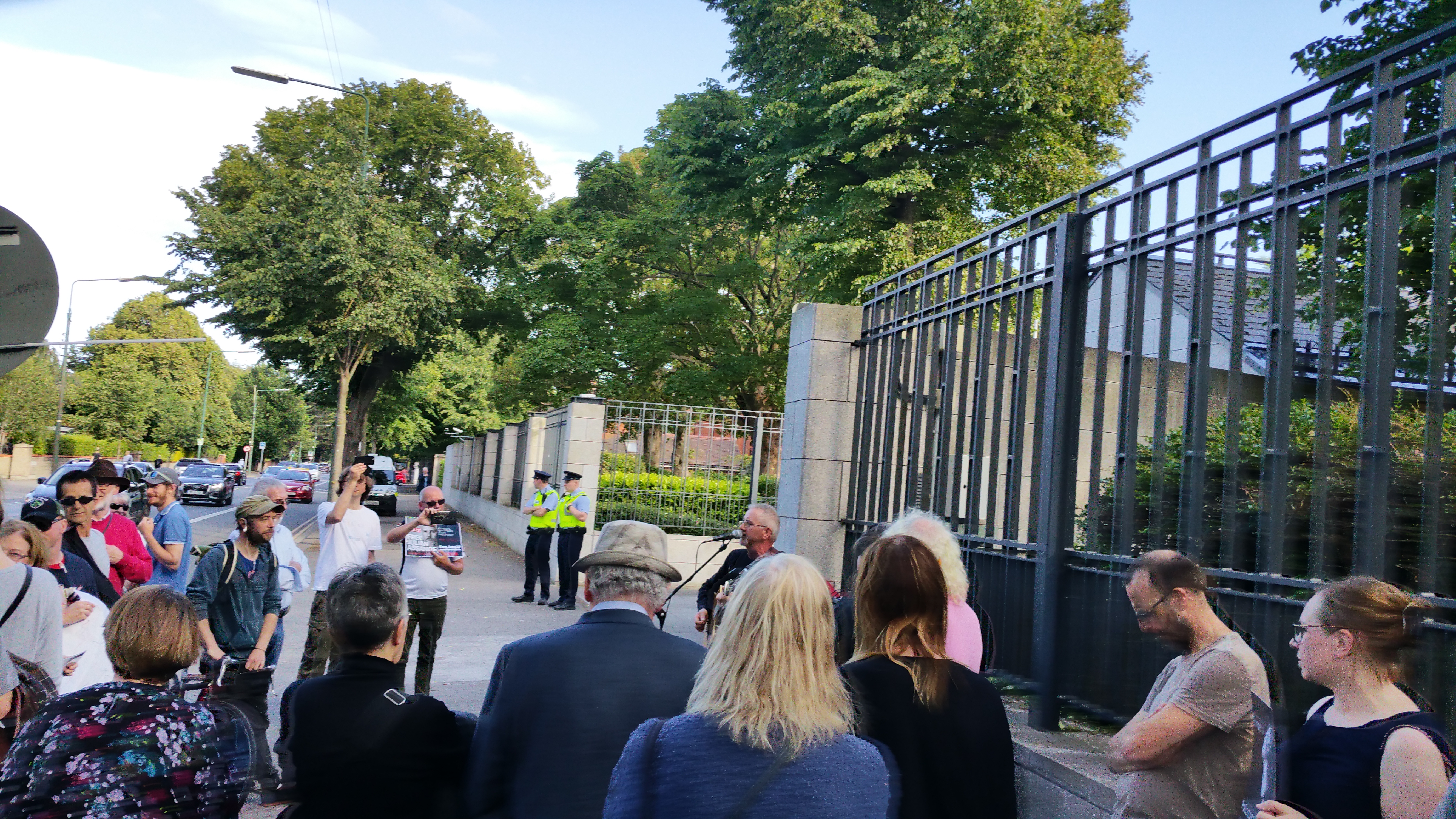 Today, June 19th, is the anniversary of the date when Julian Assange sought asylum in the Ecuadorian Embassy in London, which he was granted. That was 2012, since which he has been confined to a few rooms in that building, unable to leave for fear of British arrest and extradition to the US, where he is wanted for broadcasting their secrets on their murderous campaigns in Afghanistan and Iraq and other matters. A crowd gathered outside the British Embassy to demand Assange be set free – among them as speakers were TDs Clare Daly, Mick Wallace, along with Nobel Peace Laureate Mairéad Corrigan and musician Paul O’Toole (also another musician).