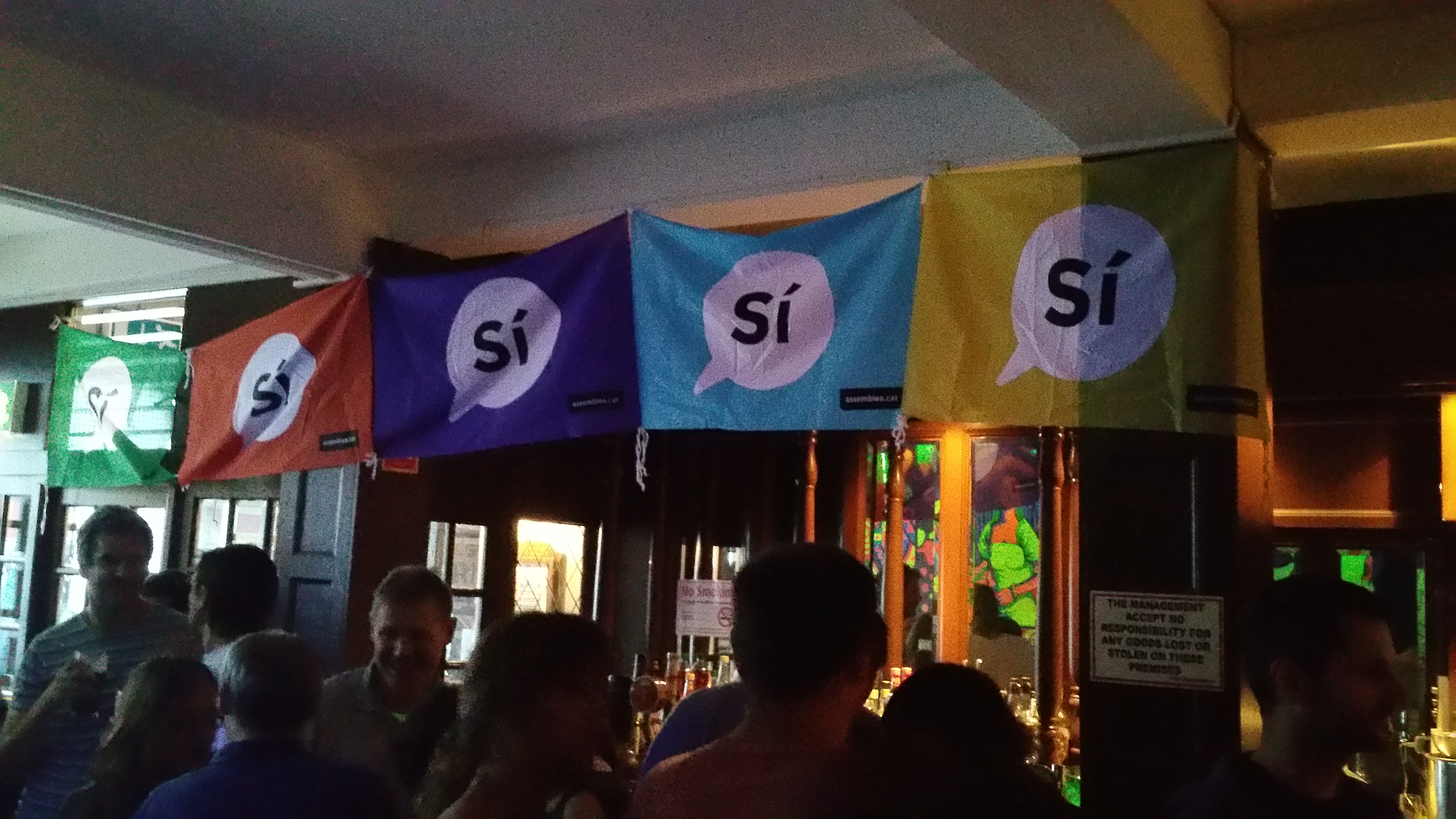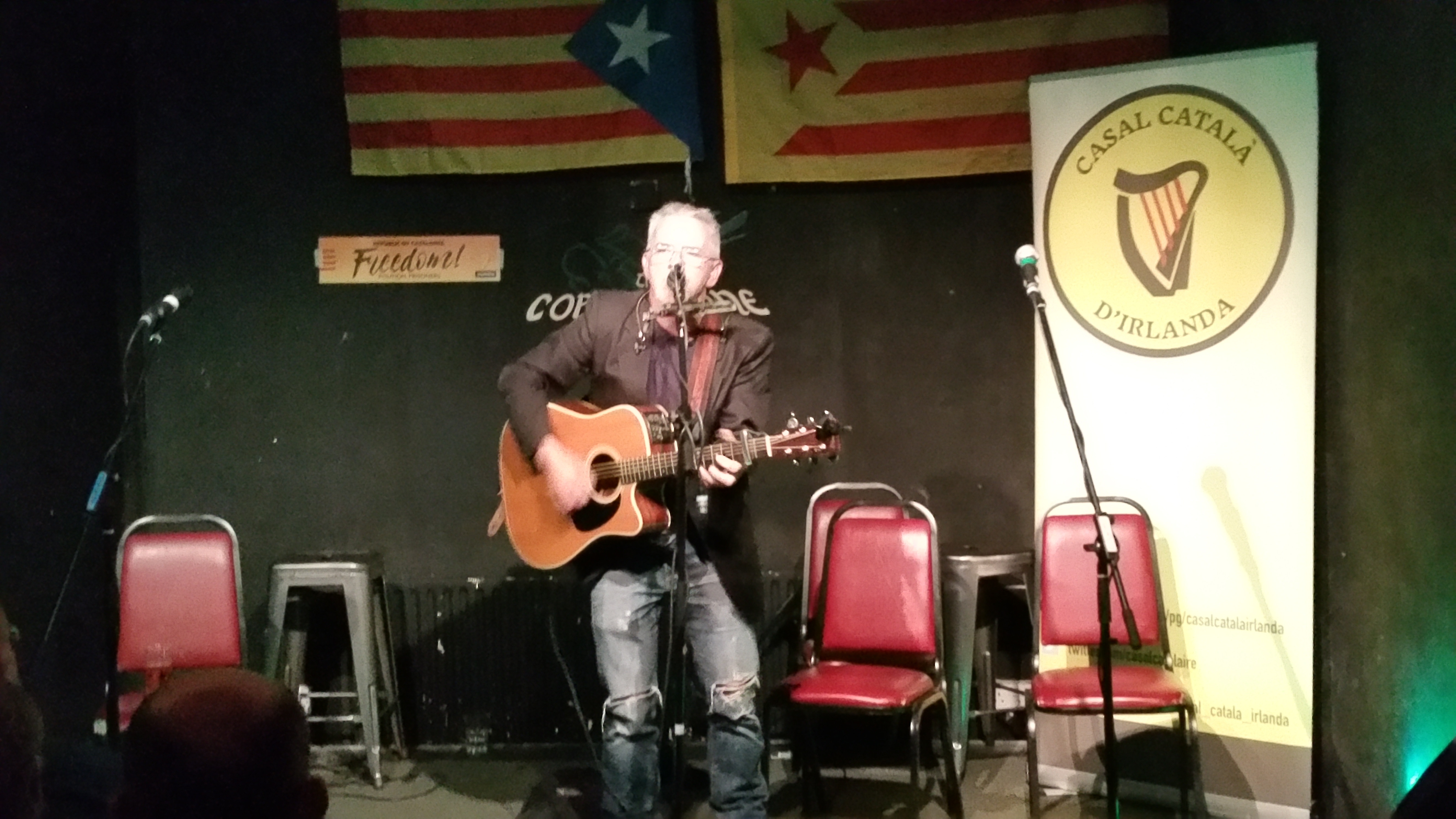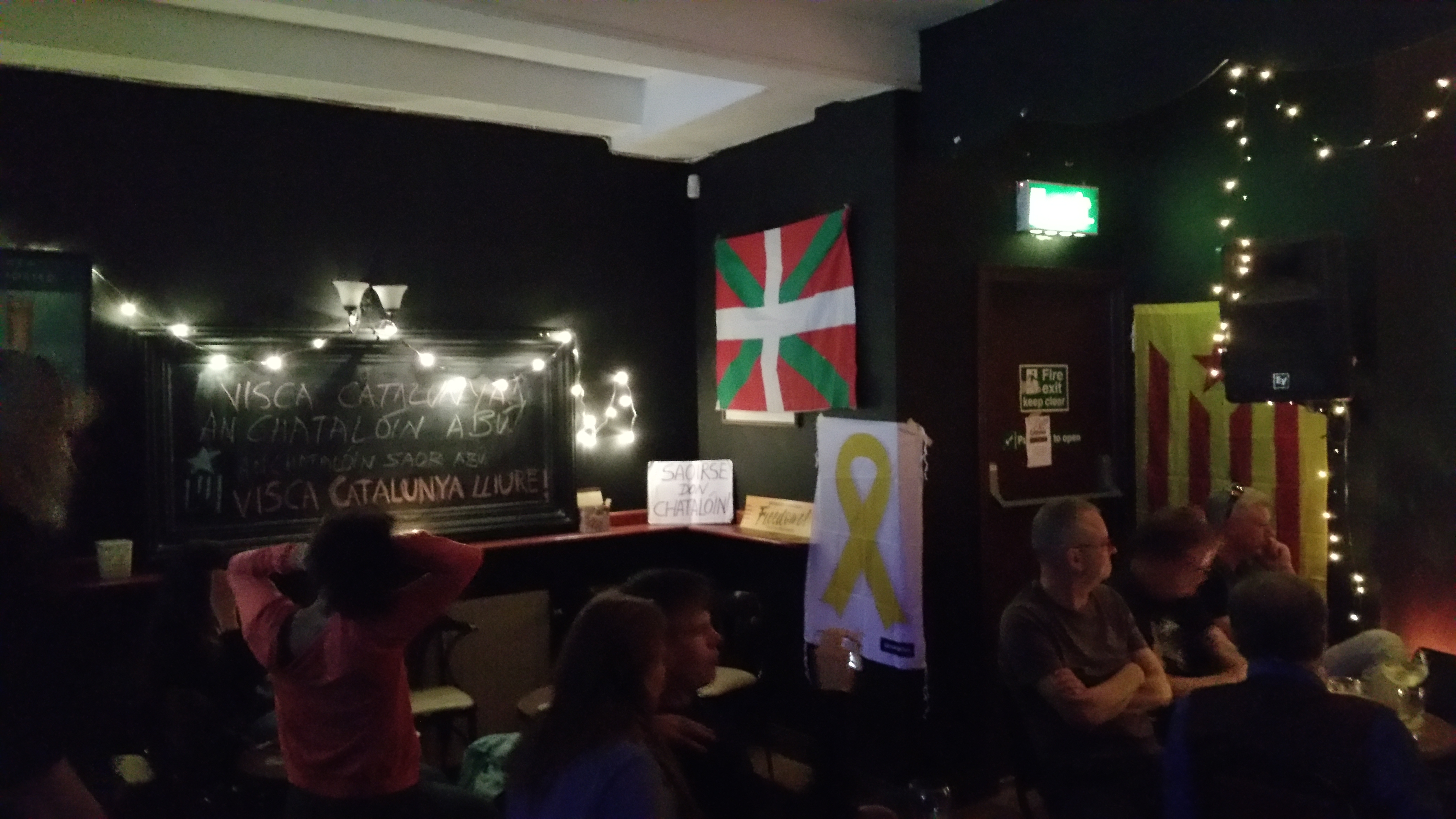 Eight different acts took to the stage in a crowded function room at the Cobblestone, which was decorated in the three varieties of the Catalan national flags (Senyera, Estelada and Vermella), and flags from the Referendum period declaring Sí, along withthe Basque Ikurrina and the Irish Starry Plough.